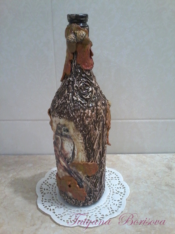 Одна из моих любимых бутылочек: " Совушка". Сова сделана в технике "объёмный декупаж", остальное- шпаклёвка, окраска.