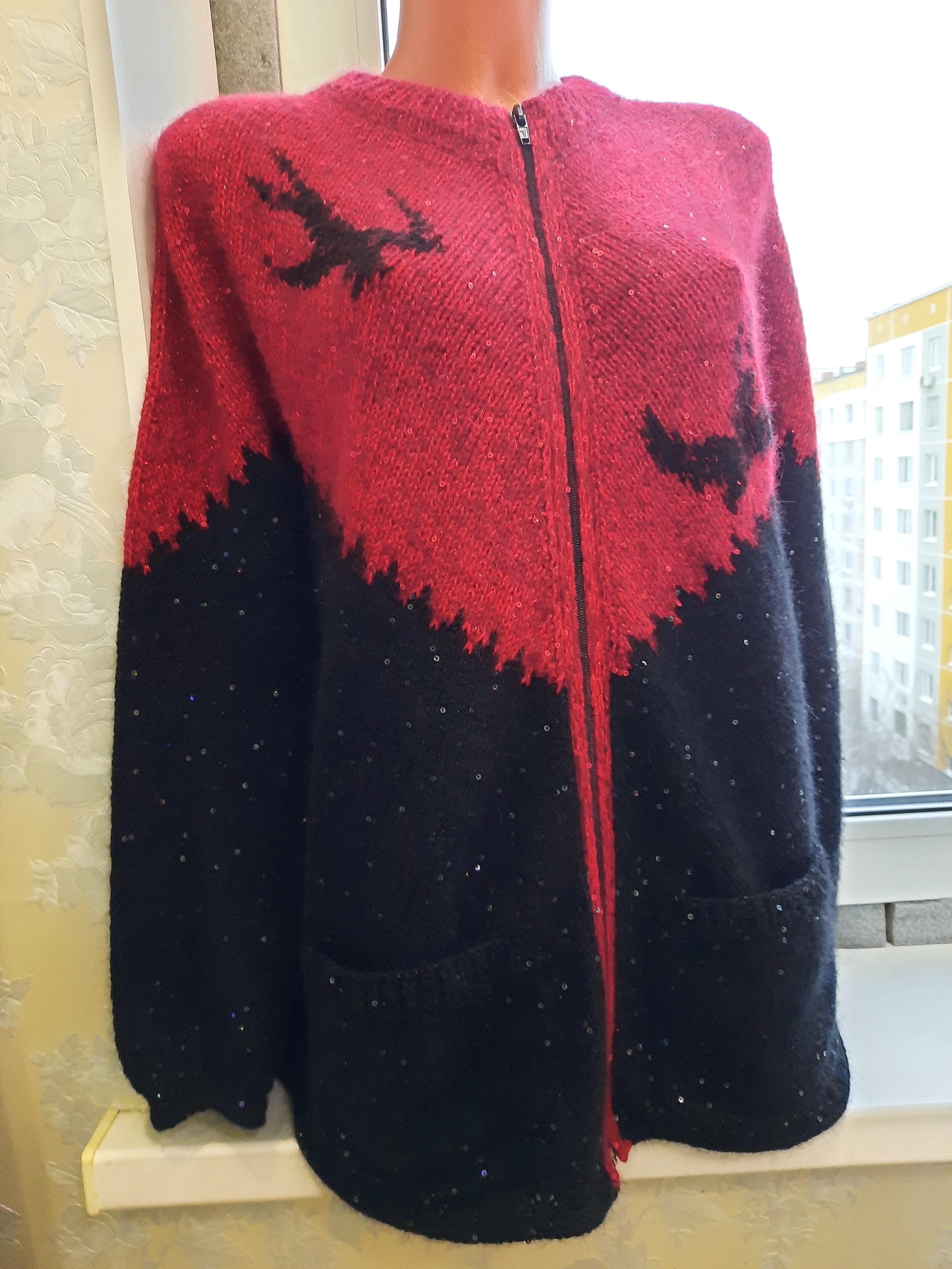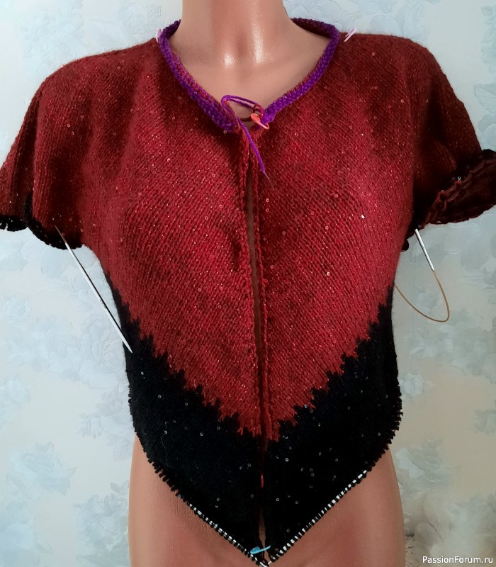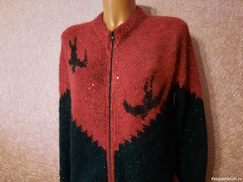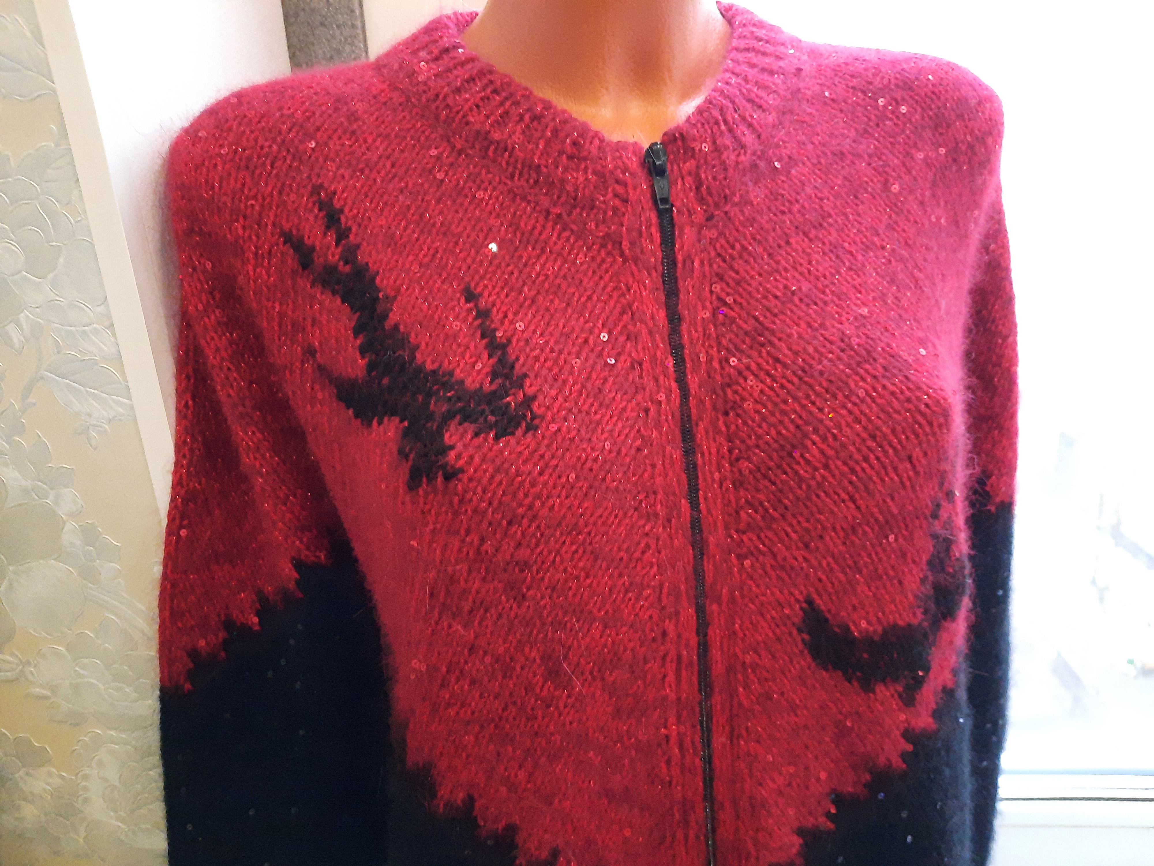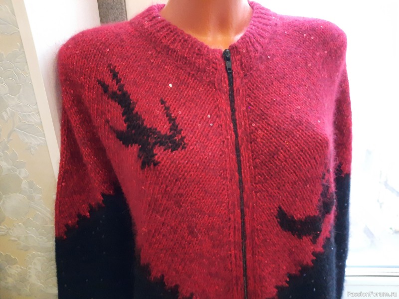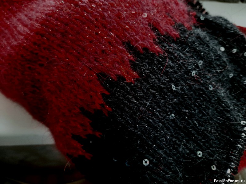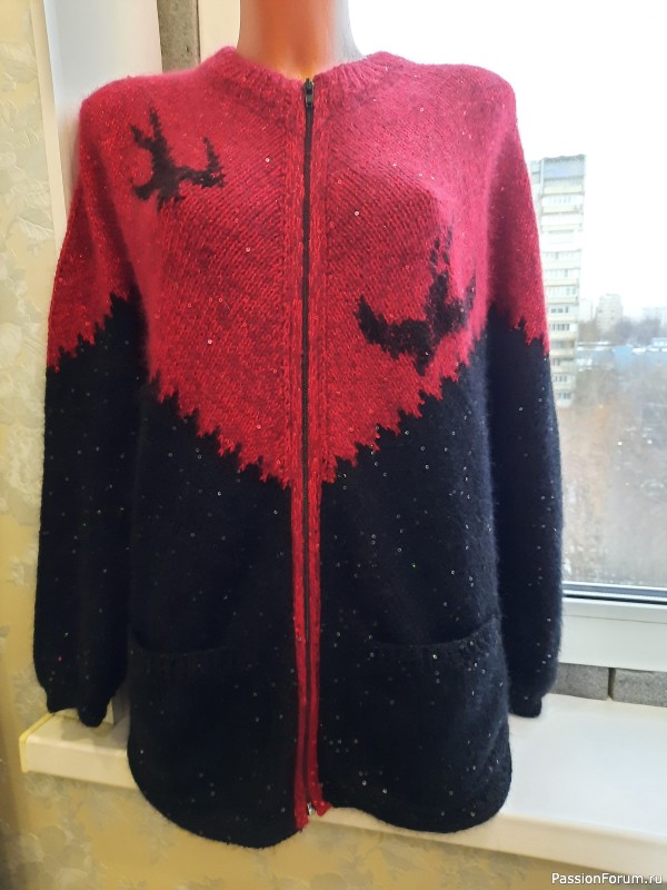 Доброе время суток всем! Когда много вяжешь, почти всегда остается пряжа 1-2 мотка и я периодически задумываюсь как ее применить. Конечно всегда легче что-то придумать когда пряжи много, а вот когда 1 или 2 мотка одного цвета и несколько другого и причем разного качества, вот нужно хорошо поразмышлять. Вот и на этот раз у меня был 1 красный и 2 черных моточка пряжи ALIZE с люрексом и пайетками и пух норки бордовый и черный. И я соединила. В результате получился не такой яркий блеск, полотно стало толще и мягче, и как результат - теплее. На такой пряже не нужен сложный узор, поэтому вязала чулочной вязкой и вышила по петлям ласточек на полочках. Вязала без швов, сверху вниз, регланом, когда петли делятся поровну на 4 части. И вот такой кардиган получился. Скоро можно будет надеть и обновить! Надеюсь у кого-то появятся новые идеи, как использовать остатки. Всем творческих успехов!
