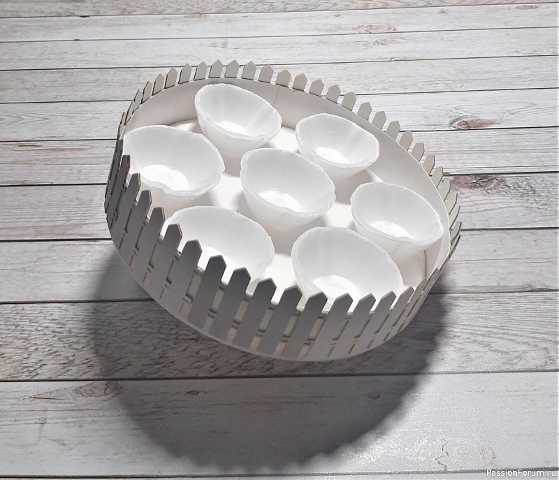 Собираем всё в целое, ячейки для яиц крепим горячим клеем, а заборчик - ПВА: