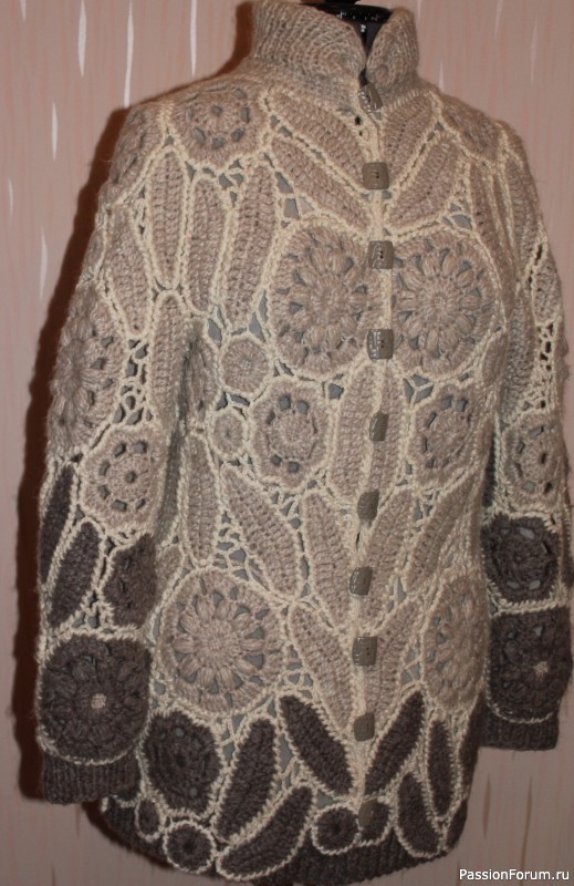 Низ жакета я оформила планкой, которую связала из распущенных мотивов. За долгие годы своей жизни пряжа не истрепалась, не потеряла вида. Планку я вязала крючком, способом "эластичная резинка", соединительными петлями за заднюю стенку. Поэтому она выглядит как связанная спицами.