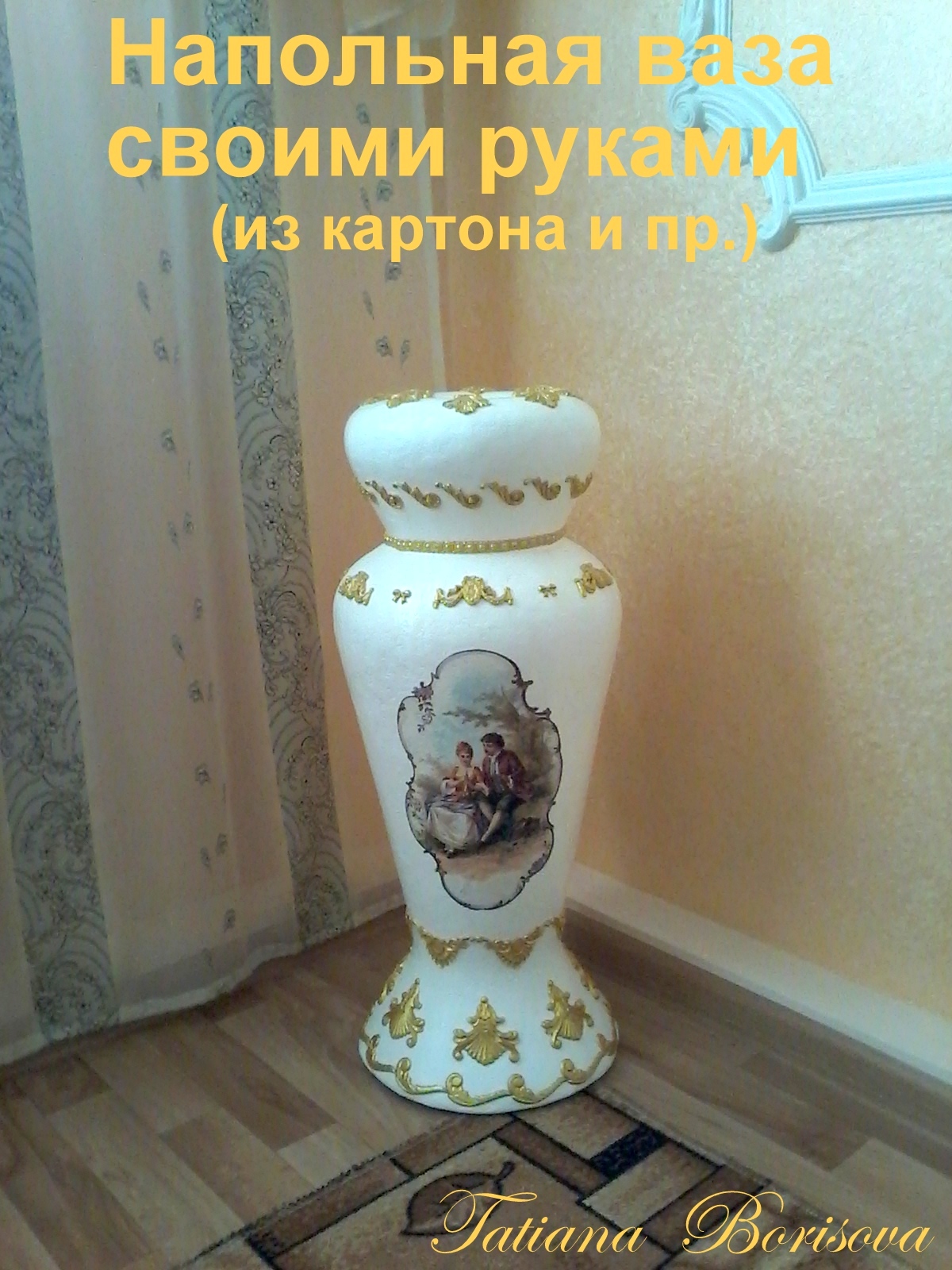 Захотелось чем-то заполнить угол в комнате. Вот такую напольную вазу я сделала из ничего, с нуля. Ваза из картона, бумаги, шпатлёвки, покрасила, украсила отливками из молдов и распечаткой, покрыла лаком.