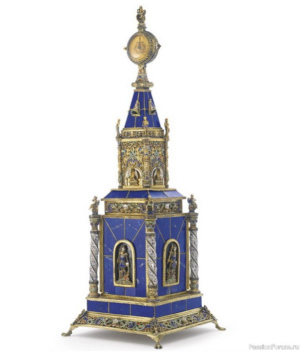 Настольные часы из серебра с лазуритом, эмалью и позолотой, высота 28,5 см, Карл Рёсслер, Вена, около 1890 г.