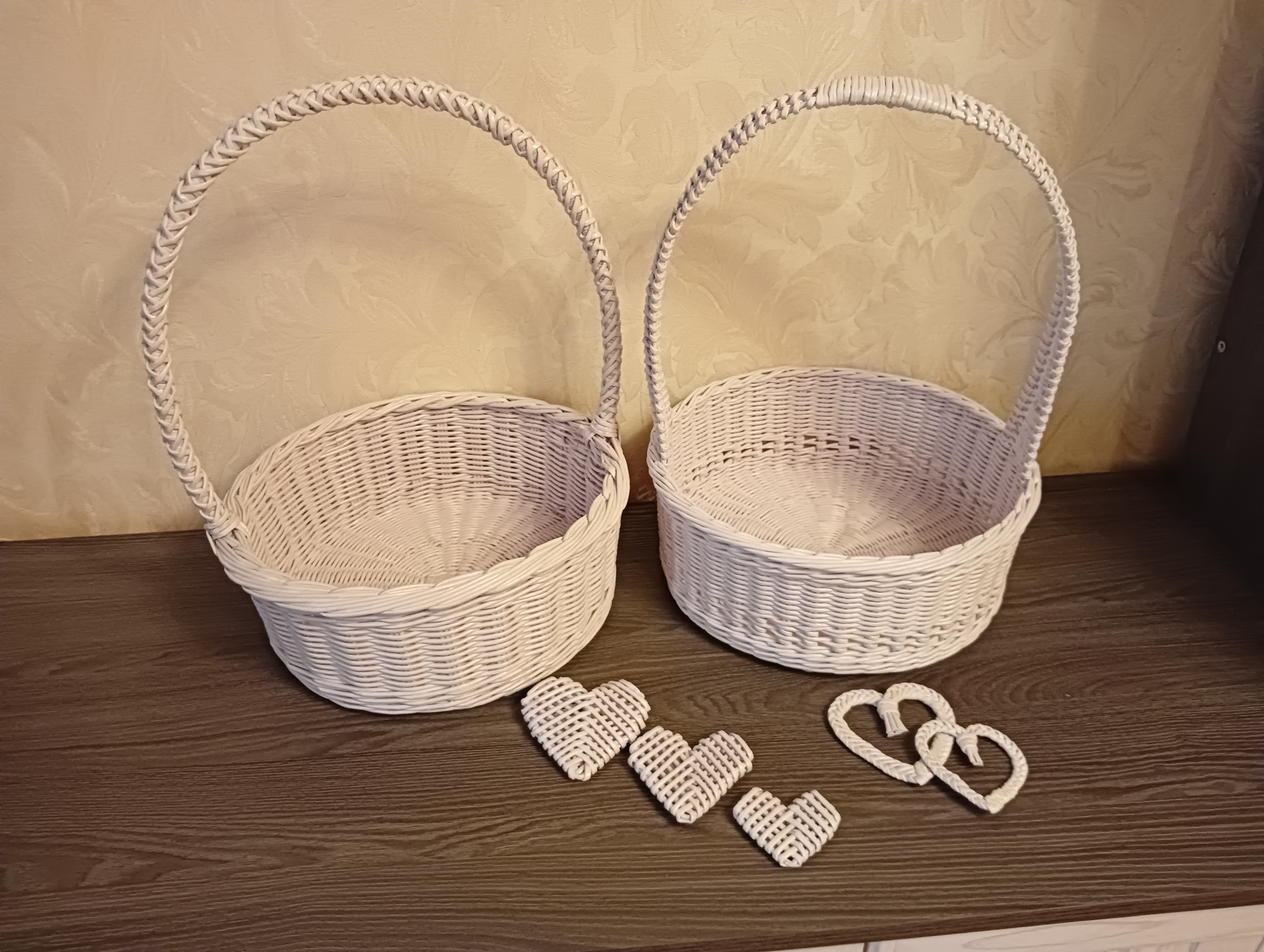 спасибо, сердечки приклеены к корзинке, только фото не успела сделать. Так и планировалось к одной приклеить, а на вторую корзинку подвески из трех сердечек.