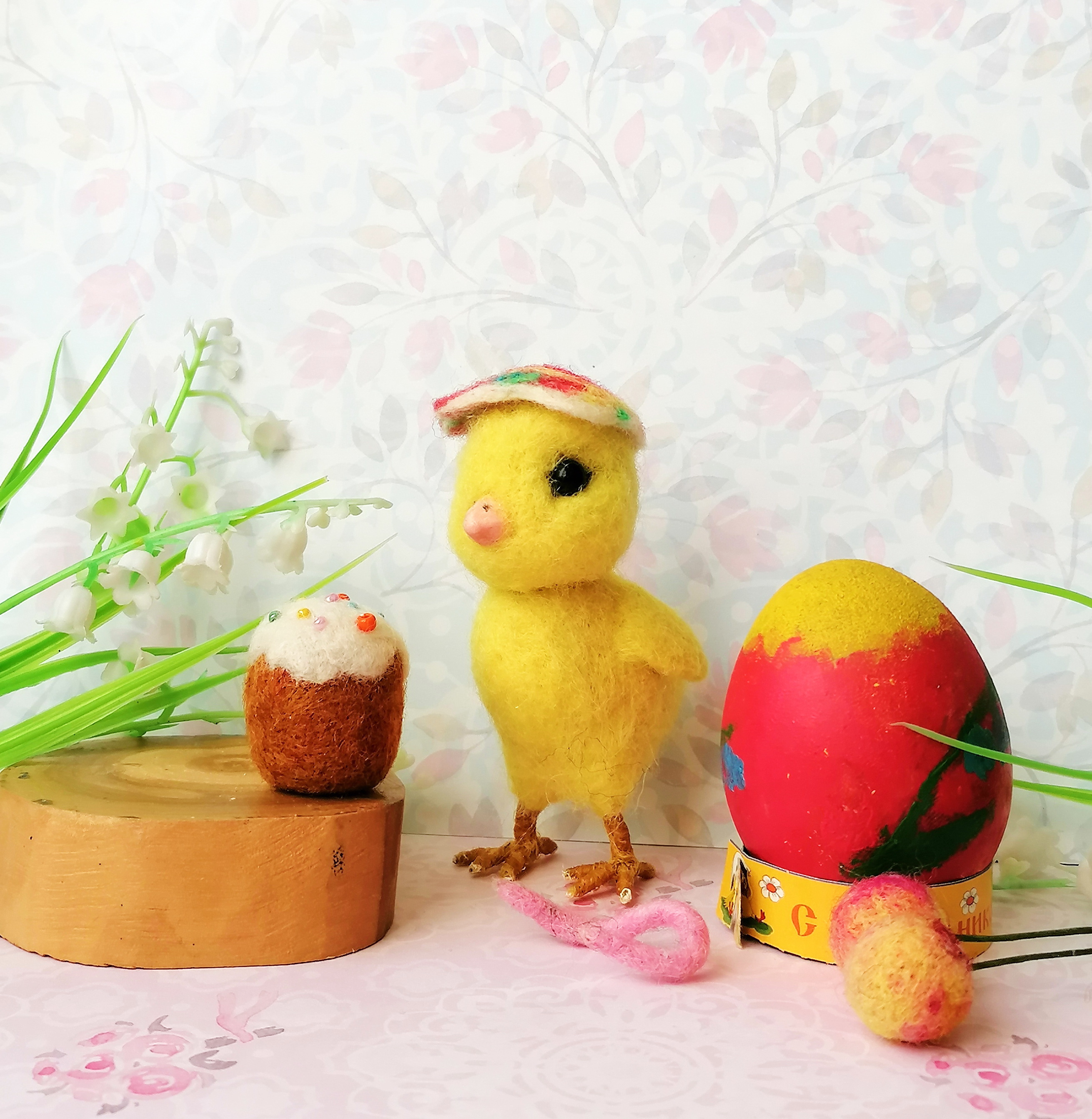 Цыплёнок замечательный! Реалистичный (у меня каждый год наседка выводит, имею представление). Только вот шляпка-скорлупка всё-таки белая нужна — из варёного яйца цыплок — как вы это себе представляете?