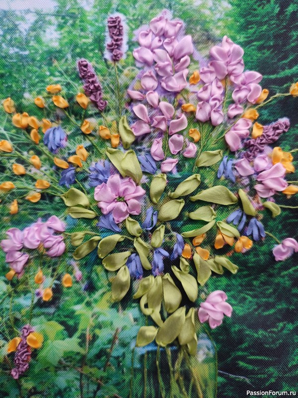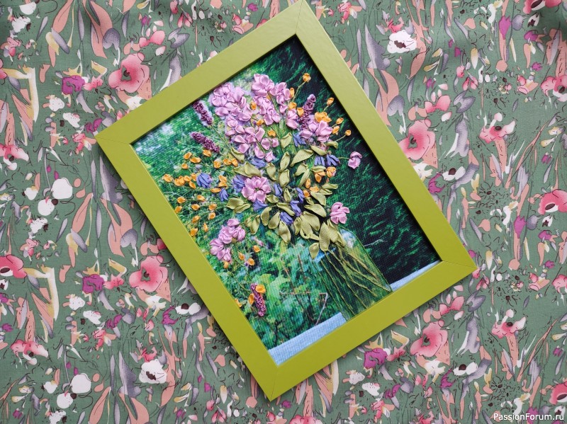 Вашему вниманию представляю три букетика, вышитых шелковыми лентами по принту на габардине.