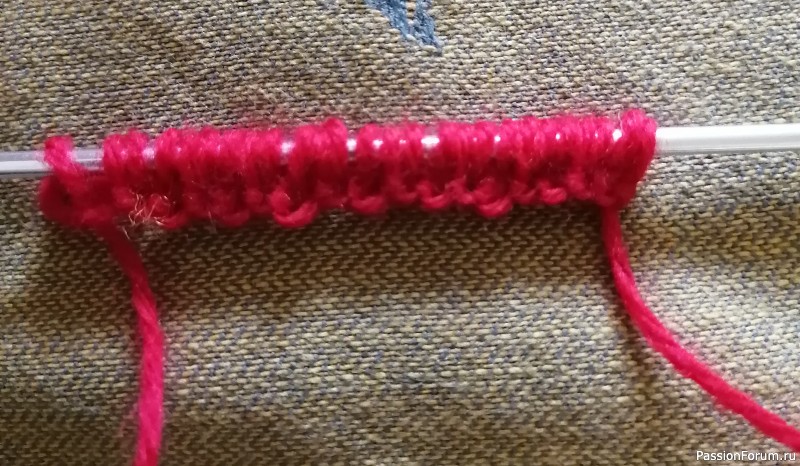 3й р. (цвет 2): *1 петля лицевая, 1 петля с накидом снимается непровязанной ещё с одним накидом*.