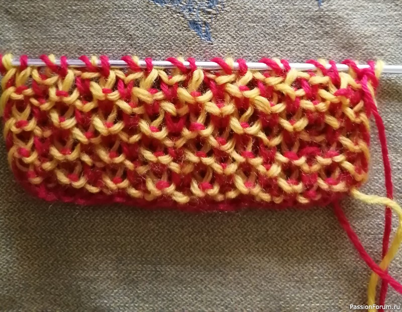 4й р. (цвет 1): *1 петля с 2 накидами над ней провязываются вместе лицевой, 1 петля снимается непровязанной с накидом.* Дойдя до конца ряда, вязание не поворачиваем, вяжем другим цветом по той же стороне.