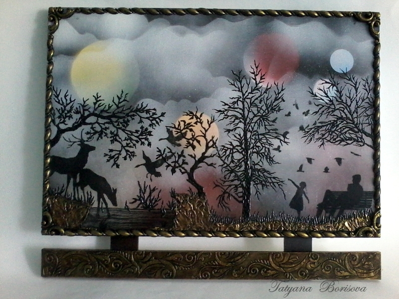 Фон, луны и облака рисовала из баллончиков. Картинки распечатала черно-белые на принтере и делала трансфер. Деревья и траву выделила черным контуром по стеклу. Рамку картине делала из самозатвердевающей массы в молдах.