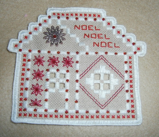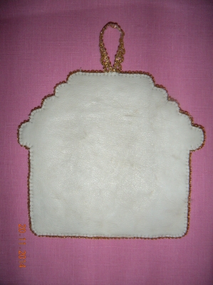 получившийся домик можно посадить на фетр, я вырезала по контуру с припусками в 5 мм и приклеивала к домику клеем момент "кристалл" или просто накрахмалить, приделать петельку и повесить на елочку)