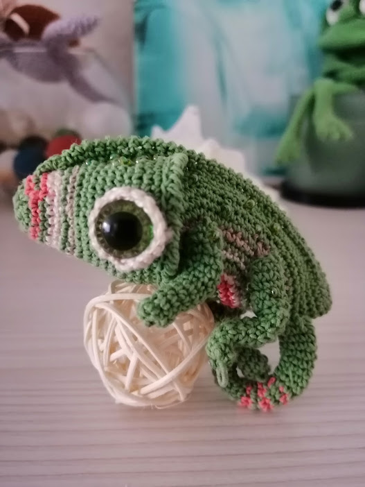 Недавно выставила свои игрушки "Трио", решила уменьшить в размере хамелеона, связать нитками потоньше. Вот что получилось...