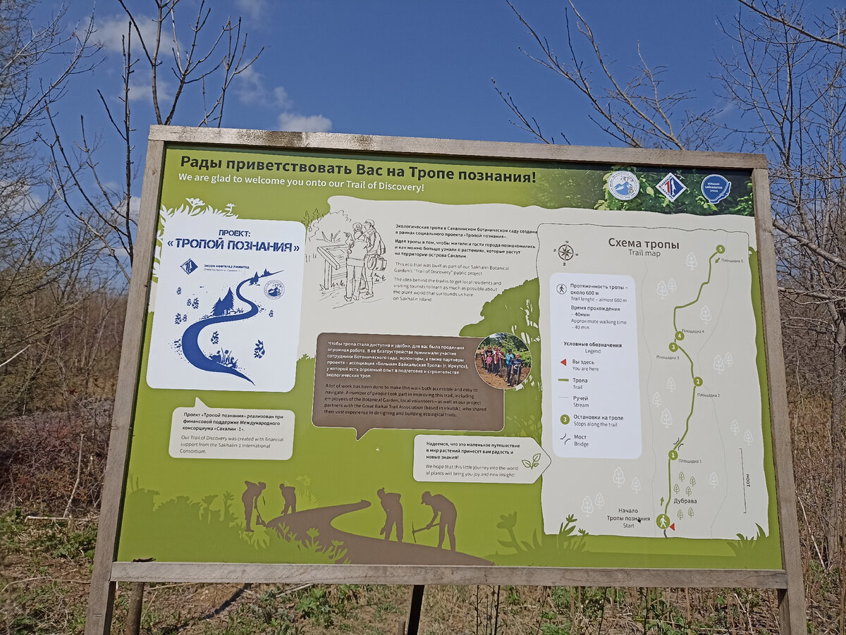 Здесь нас встречают тематические стенды, рассказывающие о сахалинской флоре и фауне. Даже есть спилы произрастающих в нашей местности деревьев. Чтобы знали)