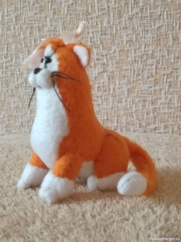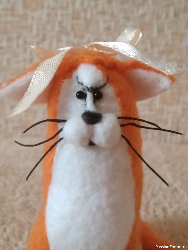 Подусники — два стянутых флисовых кружочка, внутри набивка. Нос-переносица черными нитками прошит, брови вышиты. Нос из фетра.Усы — простая чёрная нитка, обработка ПВА и чёрным акрилом. Передние лапы вшиты с изнанки, а вот задние — накладка сверху, одна общая деталь. Белые «носочки» нашивала уже на готовые лапы. Тушку зашивала на макушке, сверху уши и бант. Вся конструкция напоминает… носок, набитый синтепоном. Удачи! Хотелось бы посмотреть, что у Вас получится, покажите потом!.....