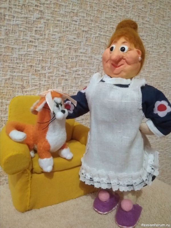В прошлом году я себе устроила проект по мотивам мультфильма о Карлсоне. Делала Карлсона, фрекен Бок и Матильду. С Матильдой пришлось помучиться больше всего. Фигура и мордуленция у неё не стандартная, характер выразительный. Надо было "поймать! да умудриться правильно передать-воплотить. Сначала я попробовала свалять Матильду из шерсти методом "сухого валяния" - а не вышло! НЕ ТА МАтильда вышла, хоть и ...какая-то тоже матильда из гламурных инстадив получилась.