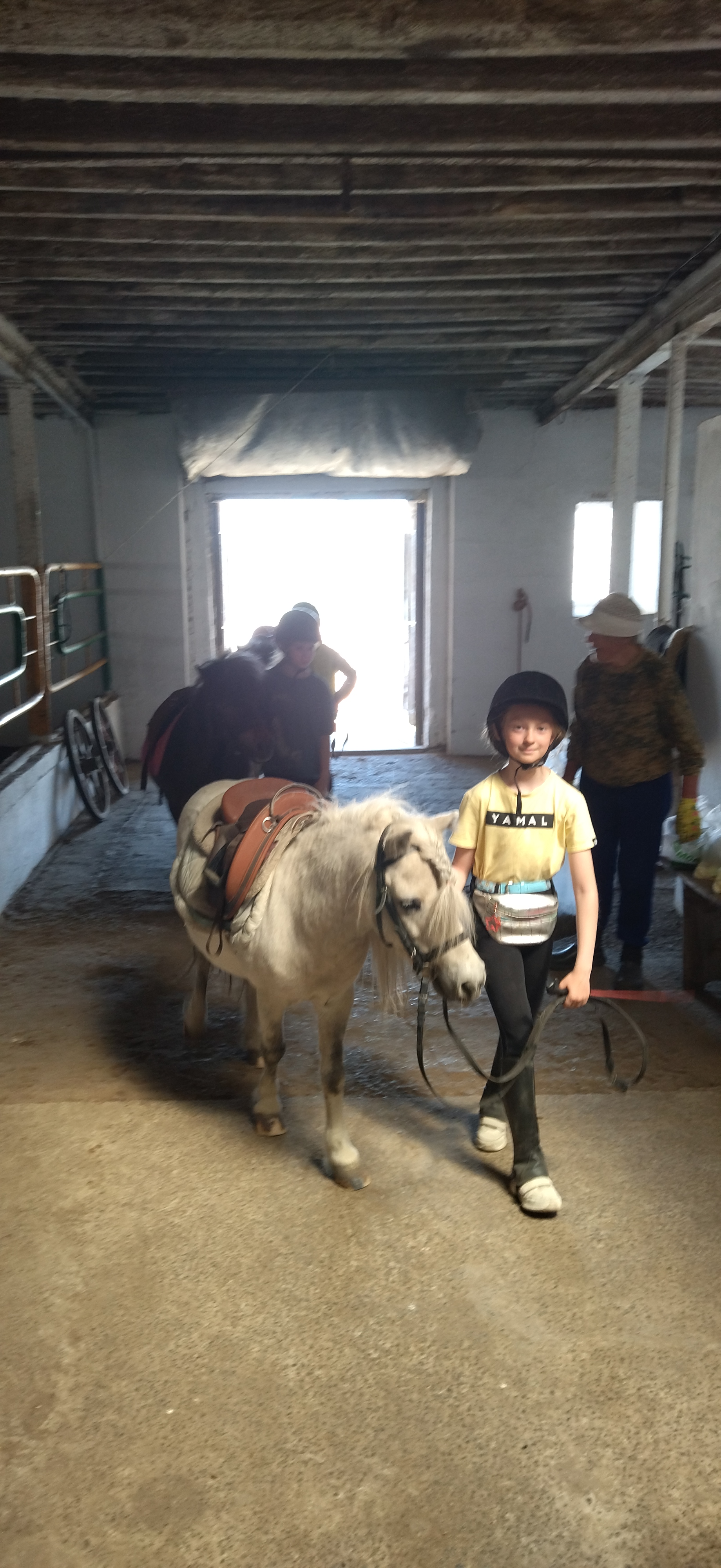 Маленькие жокеи ведут пони в конюшню