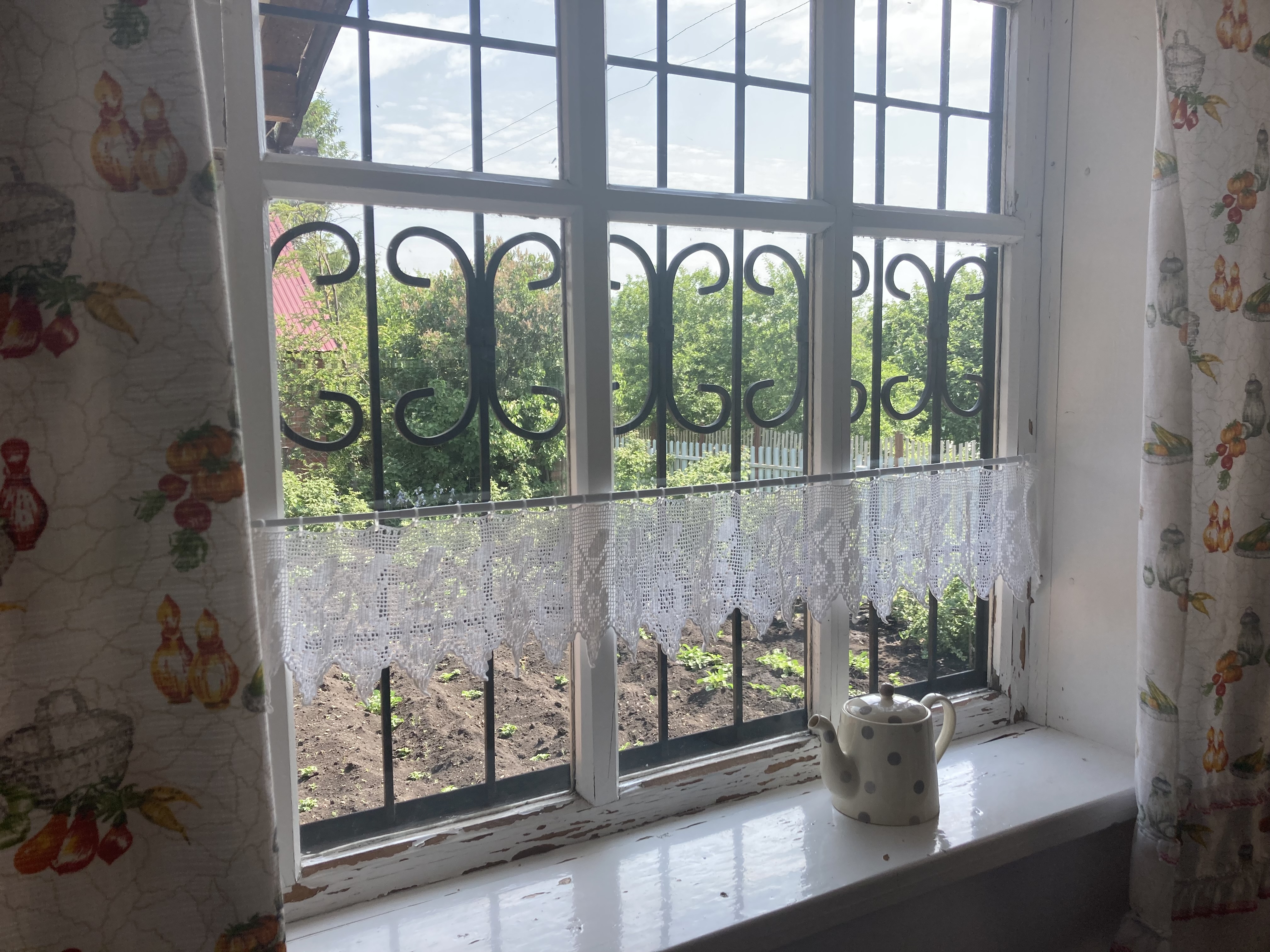 Со вторым окном на этой же веранде все оказалось сложнее. Думаю, что это кружево украшало в свое время полотенце. Совсем другой рисунок. Но это даже не "но"! Имеющийся у меня мотивчик недостаточен по ширине окна. И я снова в поиске идей о том, что же мне придумать???