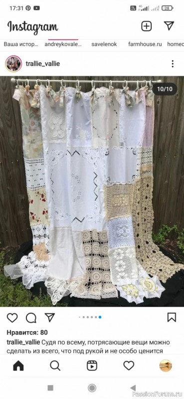 Лилия, какое богатство у Вас оказалось!!! Замечательно, что в ход его пускаете, пусть радует Вас и напоминает о близких. Что касается идеи в помощь, то думаю, что надо все-таки с тканью сочетать, чтобы ткань подчеркивала вязание. Второй вариант: довязать какие-то простенькие полоски крючком, чтобы вся занавеска была кружевной.