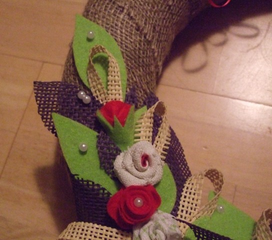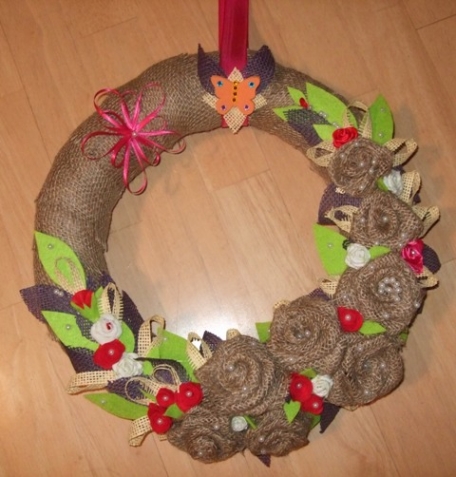 Как наступает новое время года - появляется на нашей двери сезонный веночек. А как они создаются, я вам сейчас и расскажу. Начнём с летнего. Взяла я большие газеты, разложила на полу и наложила одна на другую так, чтобы получилась длинная полоса. Скрутила её, сминая и формируя кольцо, поверх скрепила скотчем, самым простым узким. Затем обмотала кольцо лентой из мешка - мешковиной. Из такой же ленты крутились "розы". "Ушёл" практически целый большой (картофельный) мешок. И получилось вот так: