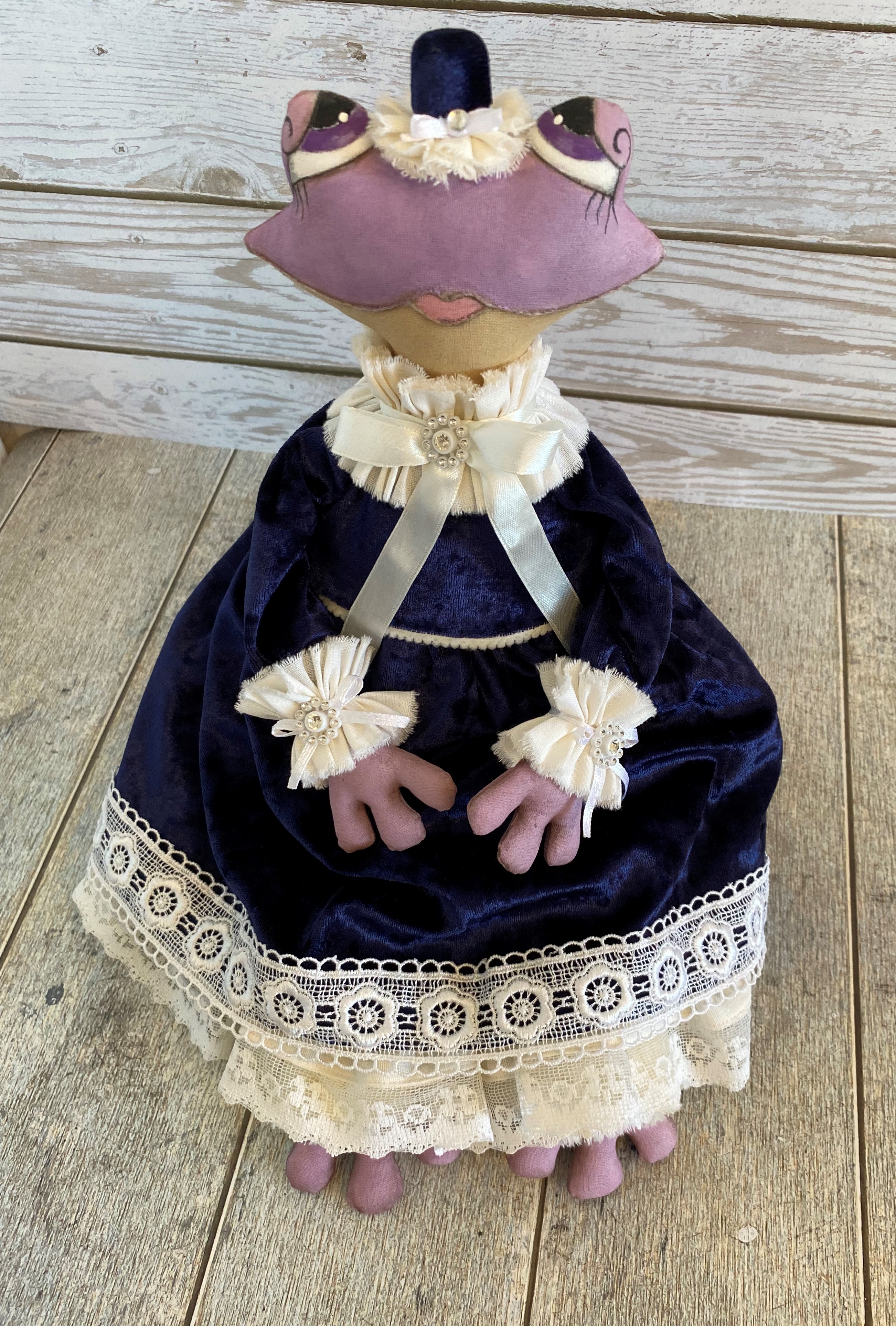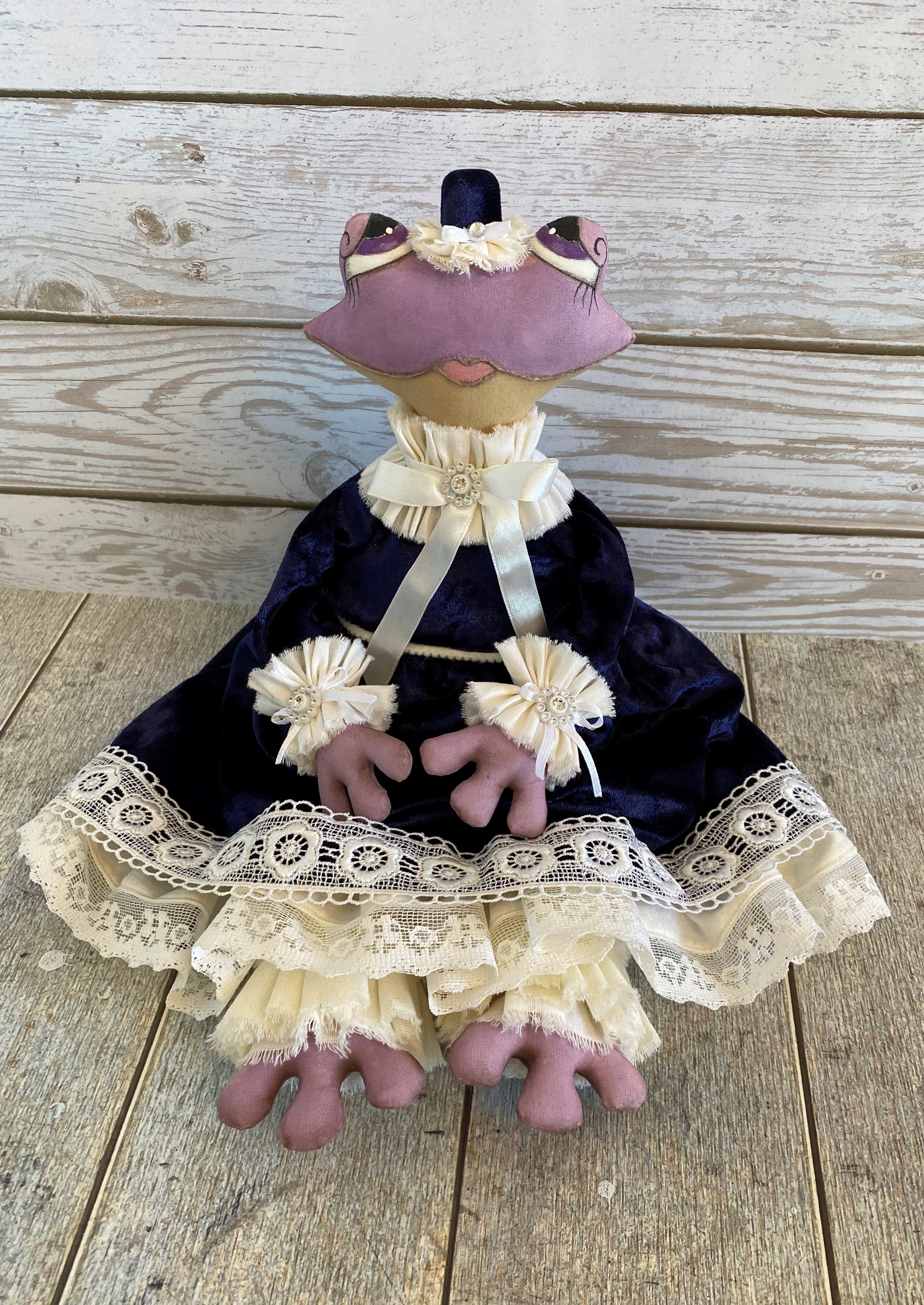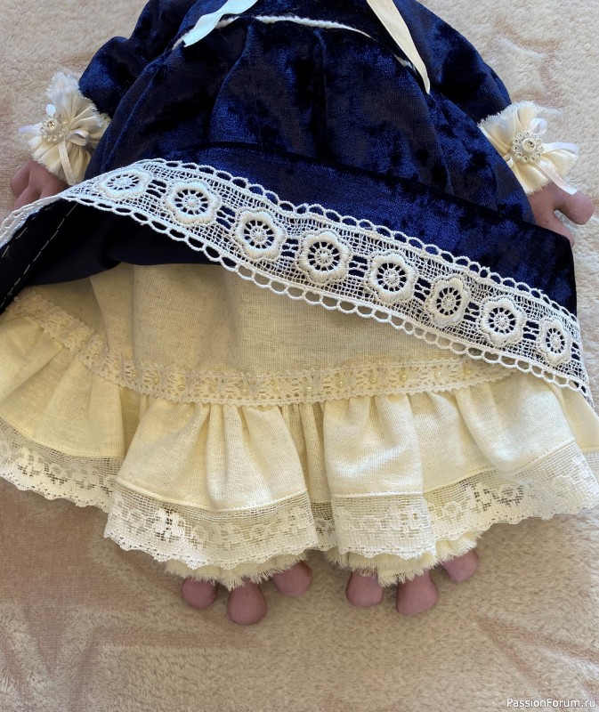 Одежда выполнена из бархата, украшена кружевом.