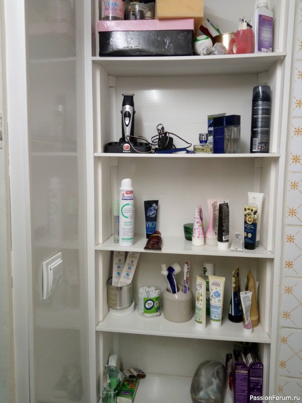 Благодаря излишкам пластика, мы обновили в ванной стеллаж. Это пространство когда-то было входом в изначальную кухню. В последствии лутка от дверей осталась, в ней были сделаны пазы, в которые установили фанерные полочки. Эта конструкция, кстати весьма полезная там, была много раз крашена, полочки от времени приняли форму хорошей дуги и, хотя держались там намертво, но не очень позволяли себя использовать по назначению, плюс очень усложняли уборку.