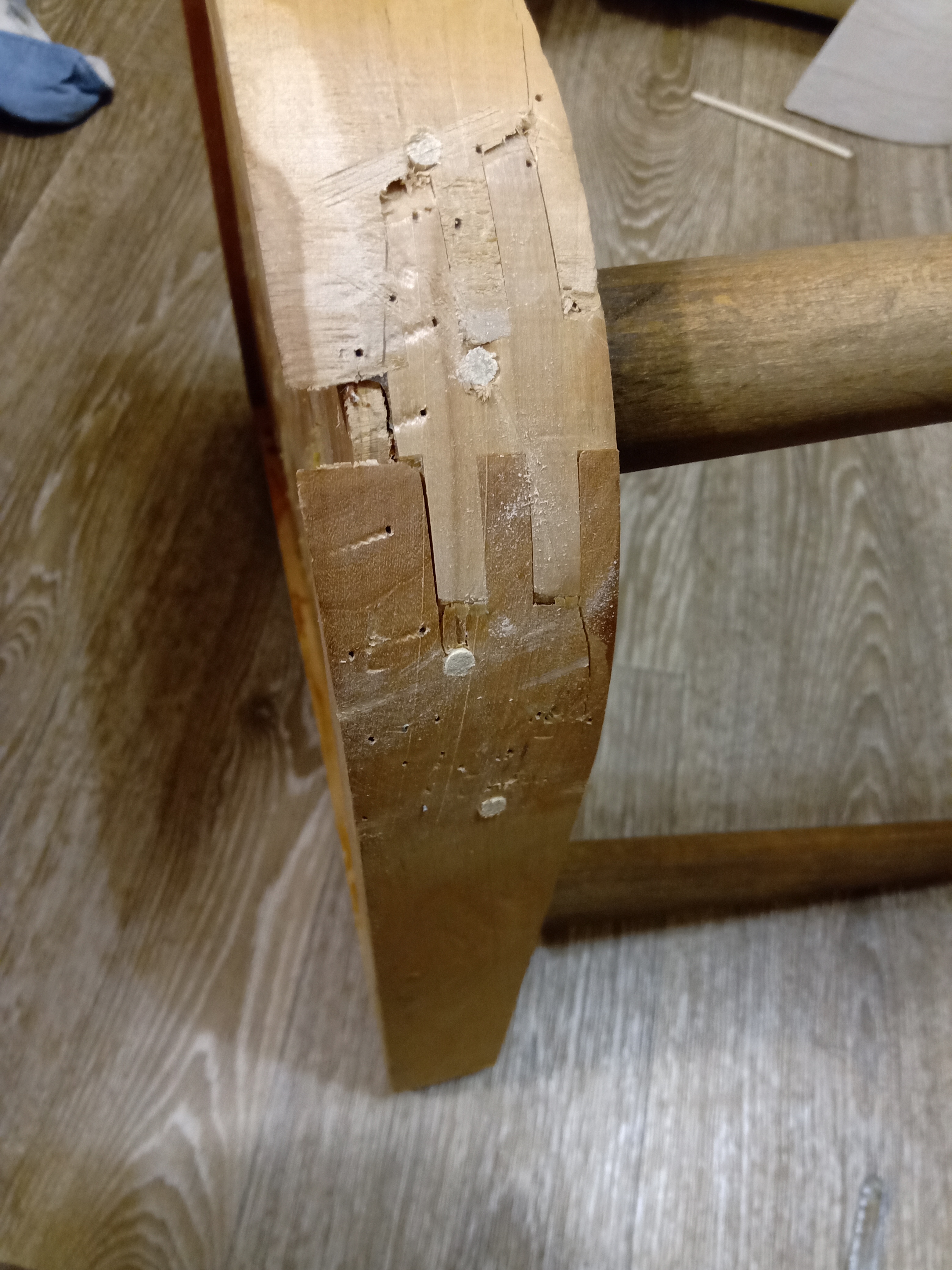 Маскировка старых отверстий крепления спинки. Маскировала забивая деревянные шканты (чопики), предварительно залив отверстия клеем. Лишнюю длину шкантов затем срезала. Зачем и почему? Потому как изначально спинка крепилась шурупами в хаотичном порядке (не по линеечке) и попасть в последствии в эти отверстия может быть проблематично.
