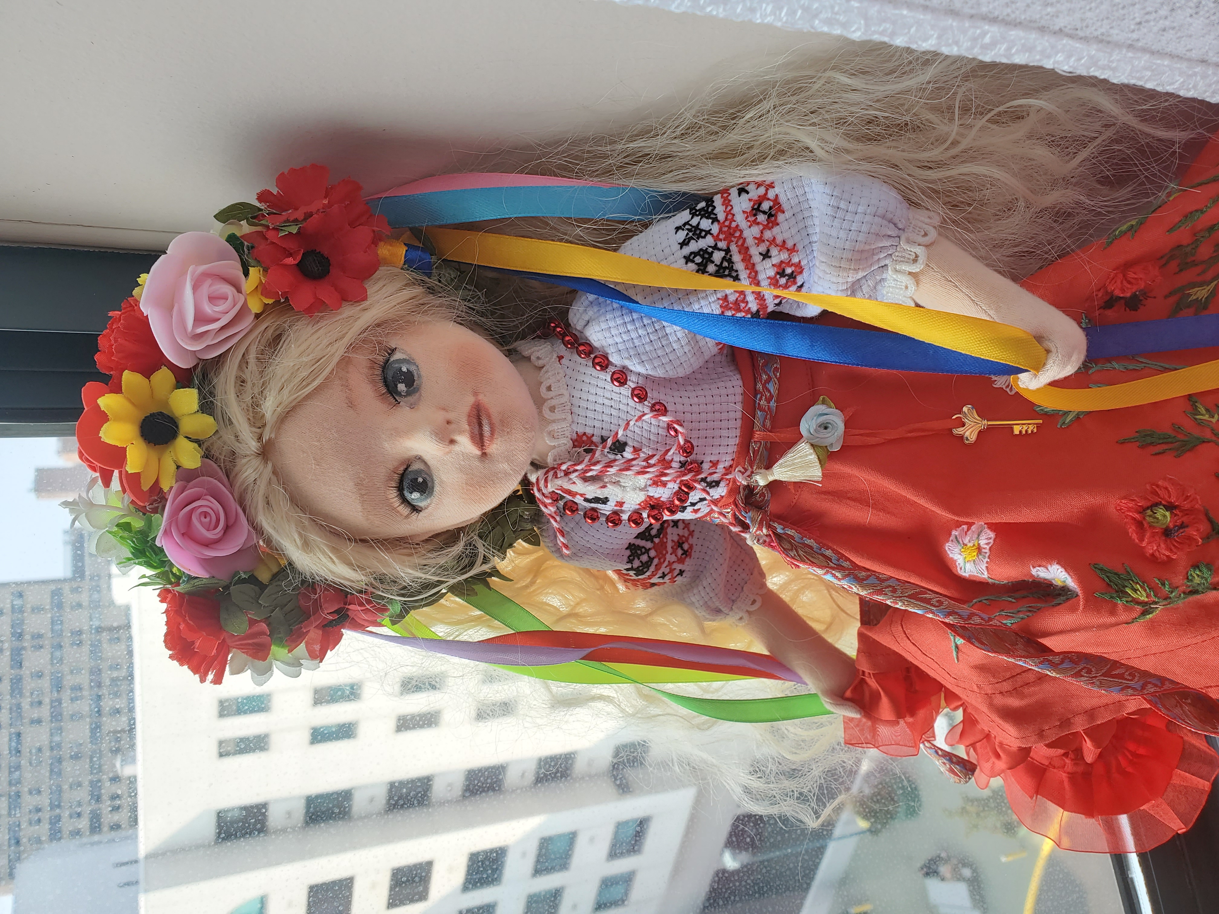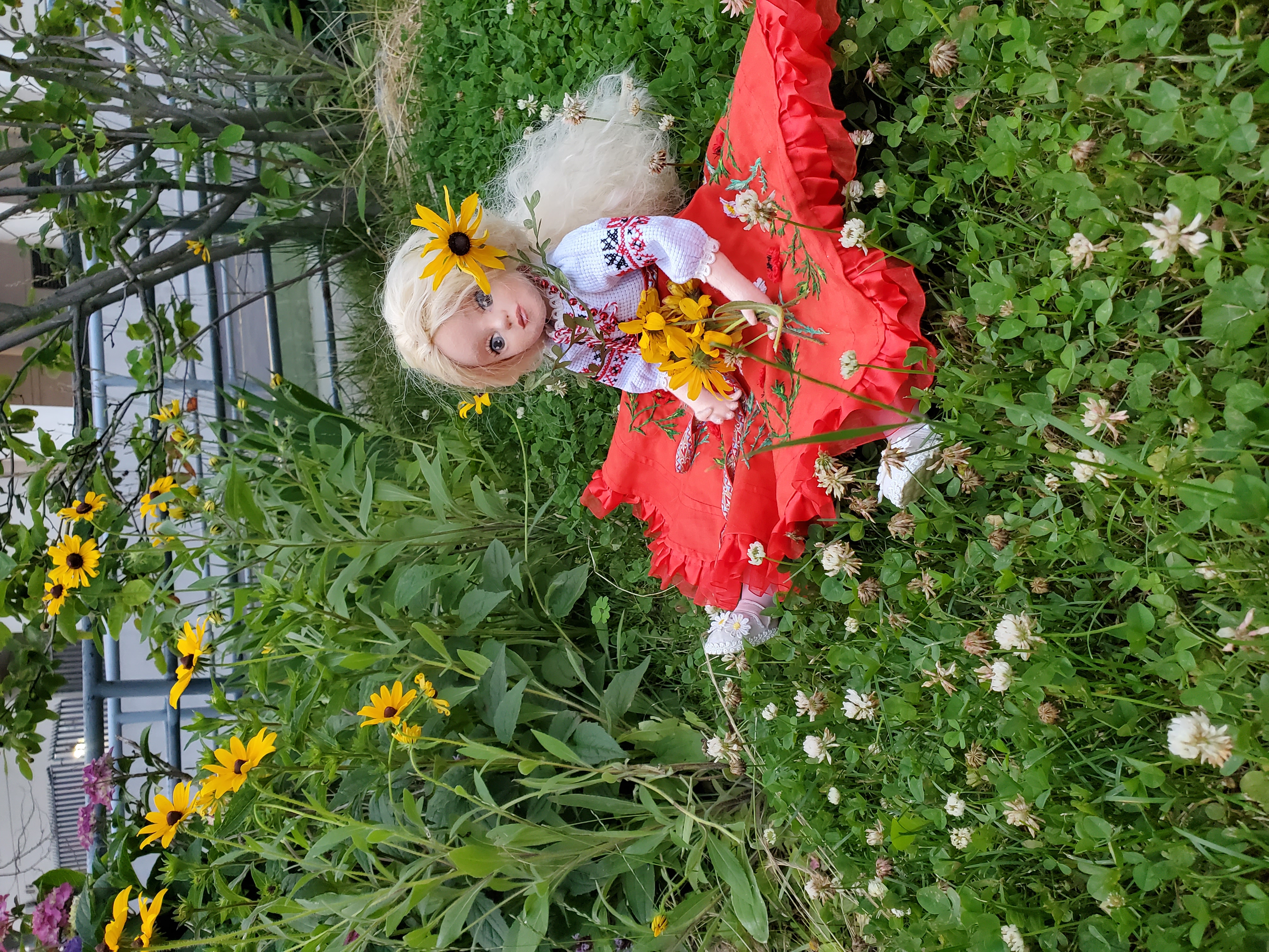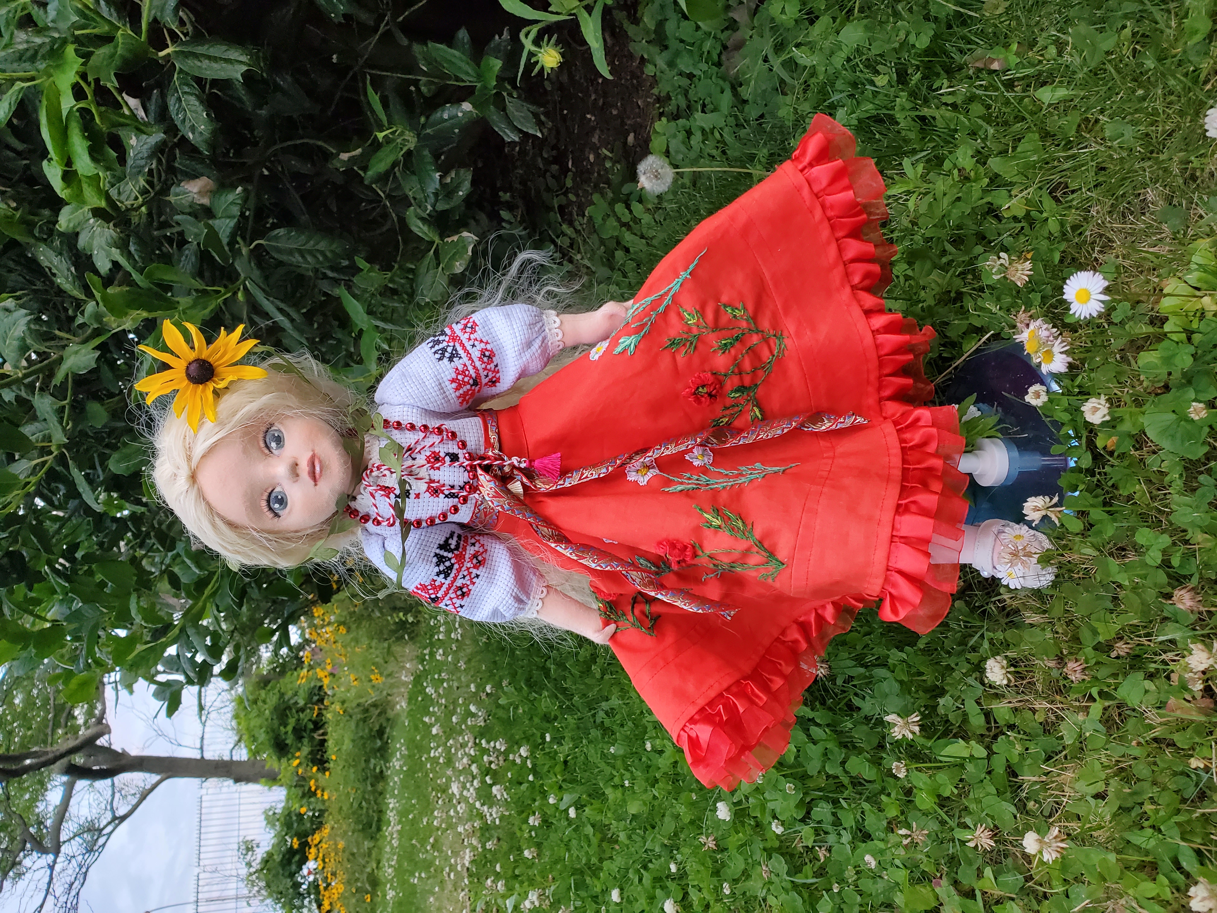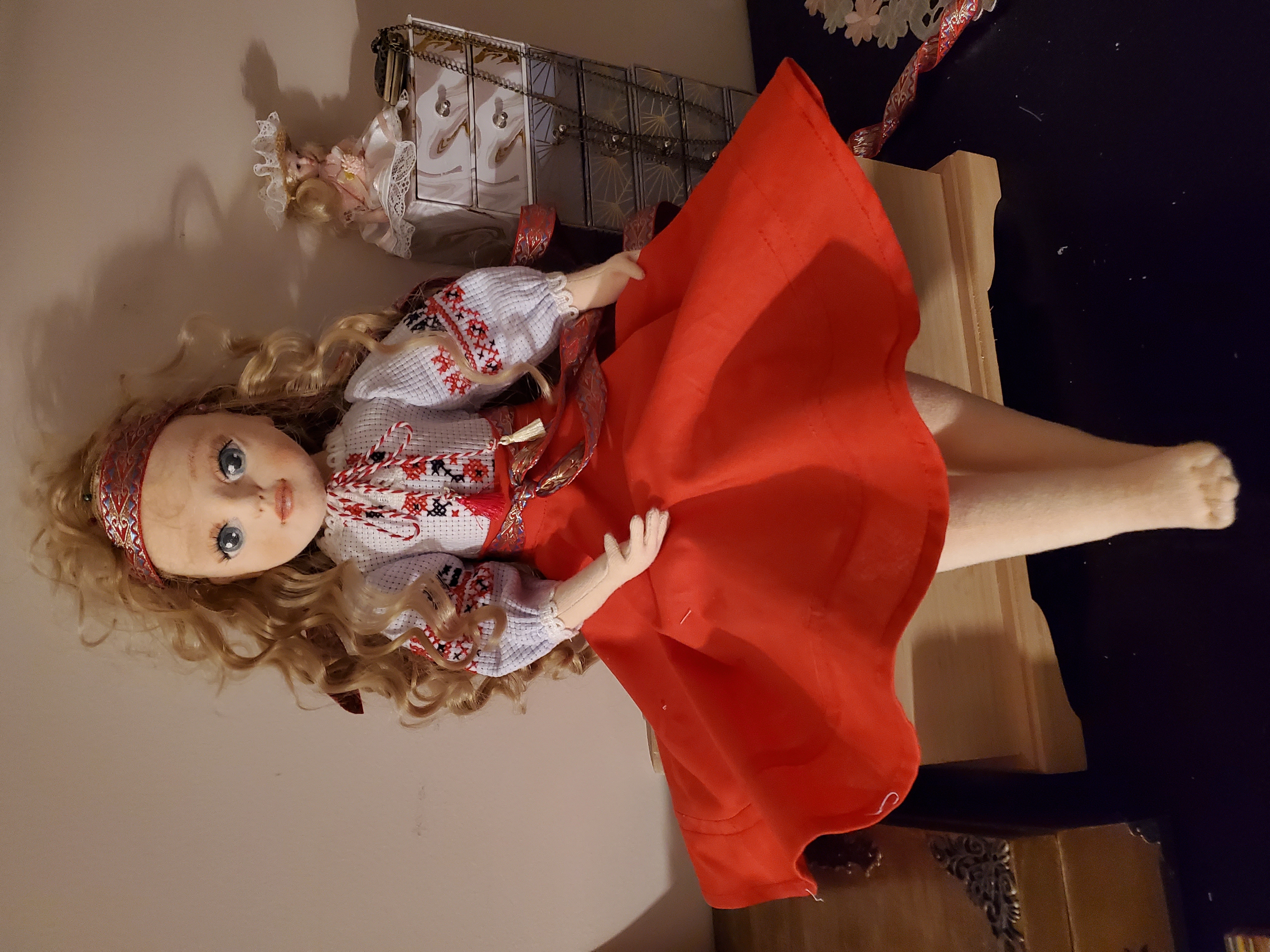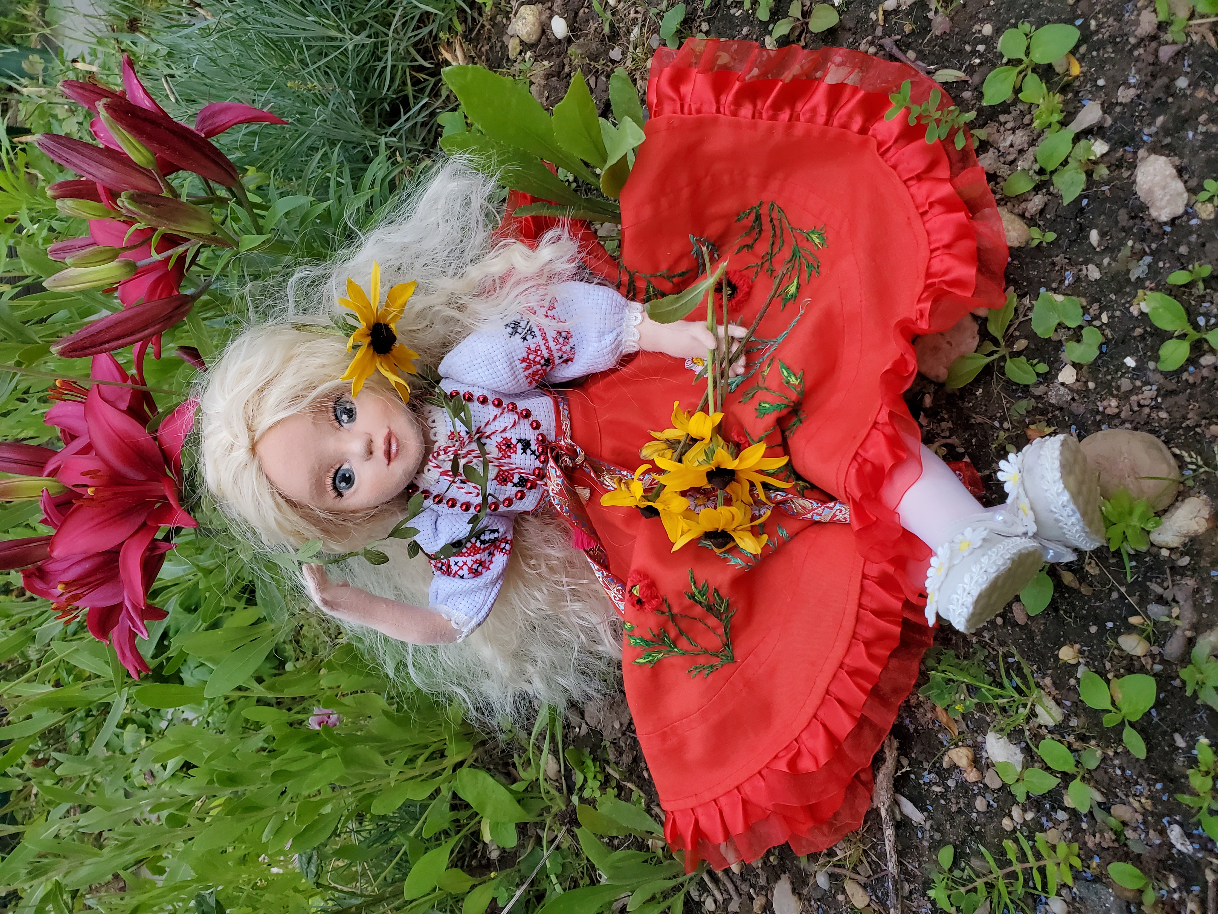 Из ткани, на шарнирах, выполнена из органических опилок, купленных на Amazon, глазки, губки расписаны вручную акриловыми красками, кофточка вышита крестиком, юбочка гладью, маки-бразильская вышивка, туфельки сшиты из мягкой, перчаточной кожи, декорированные ромашками в гармонии с вышивкой.