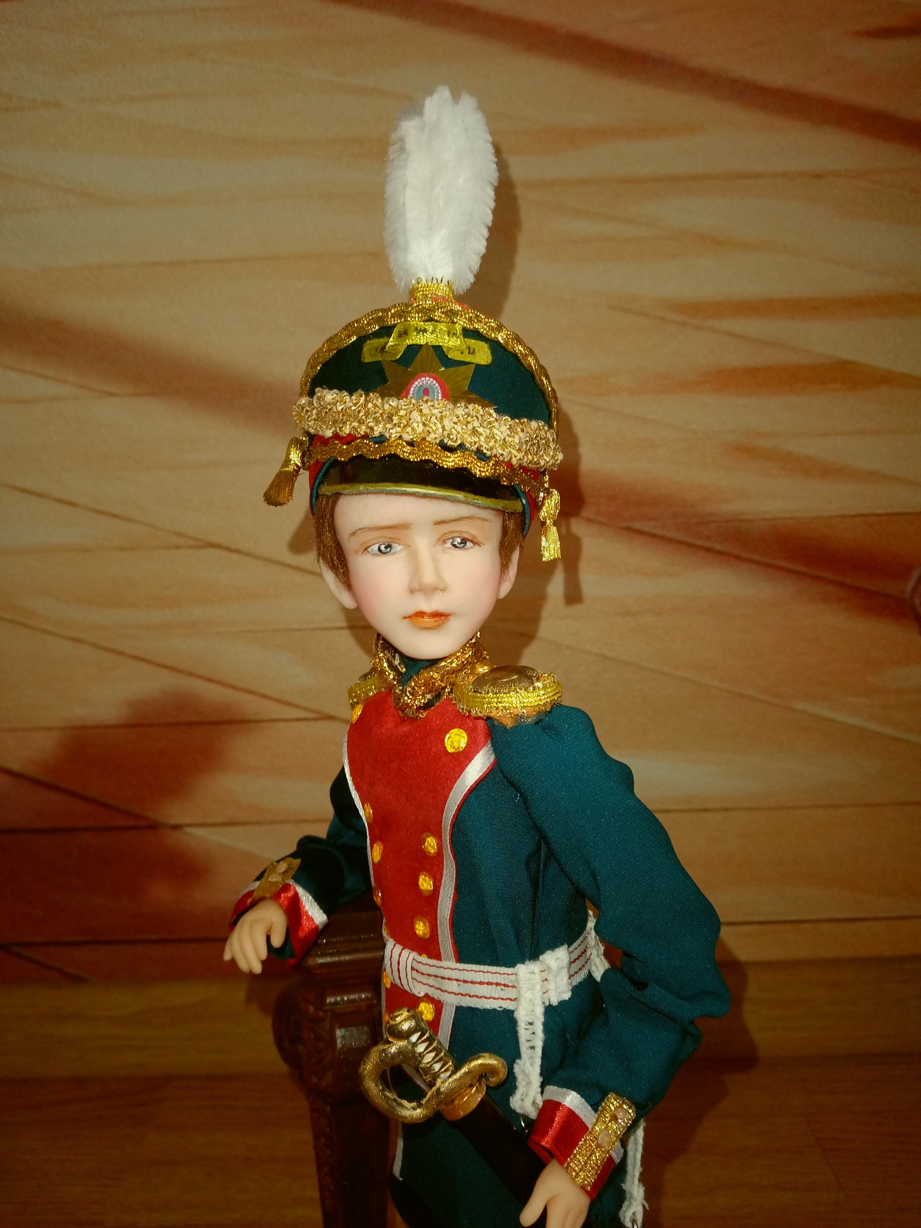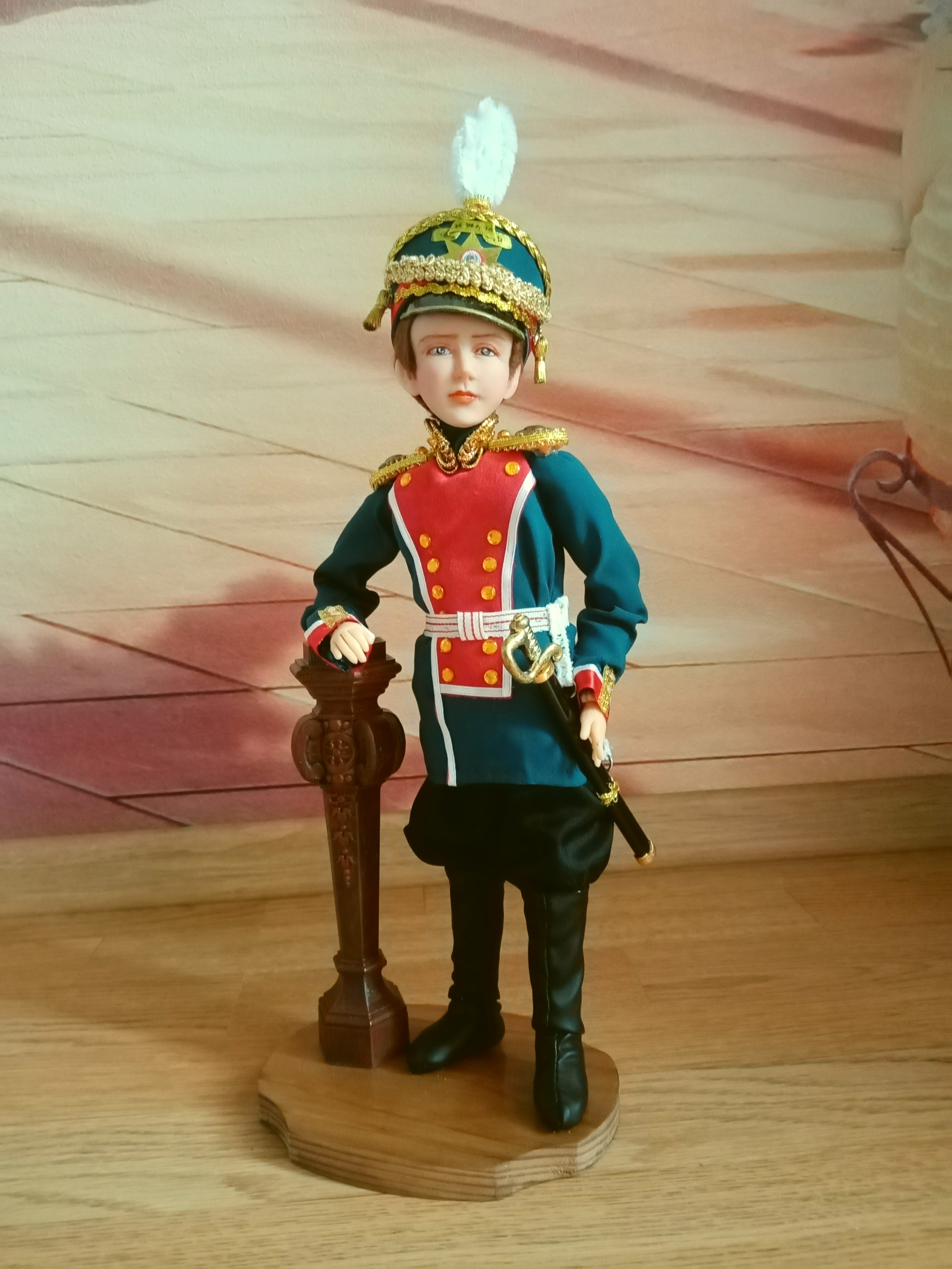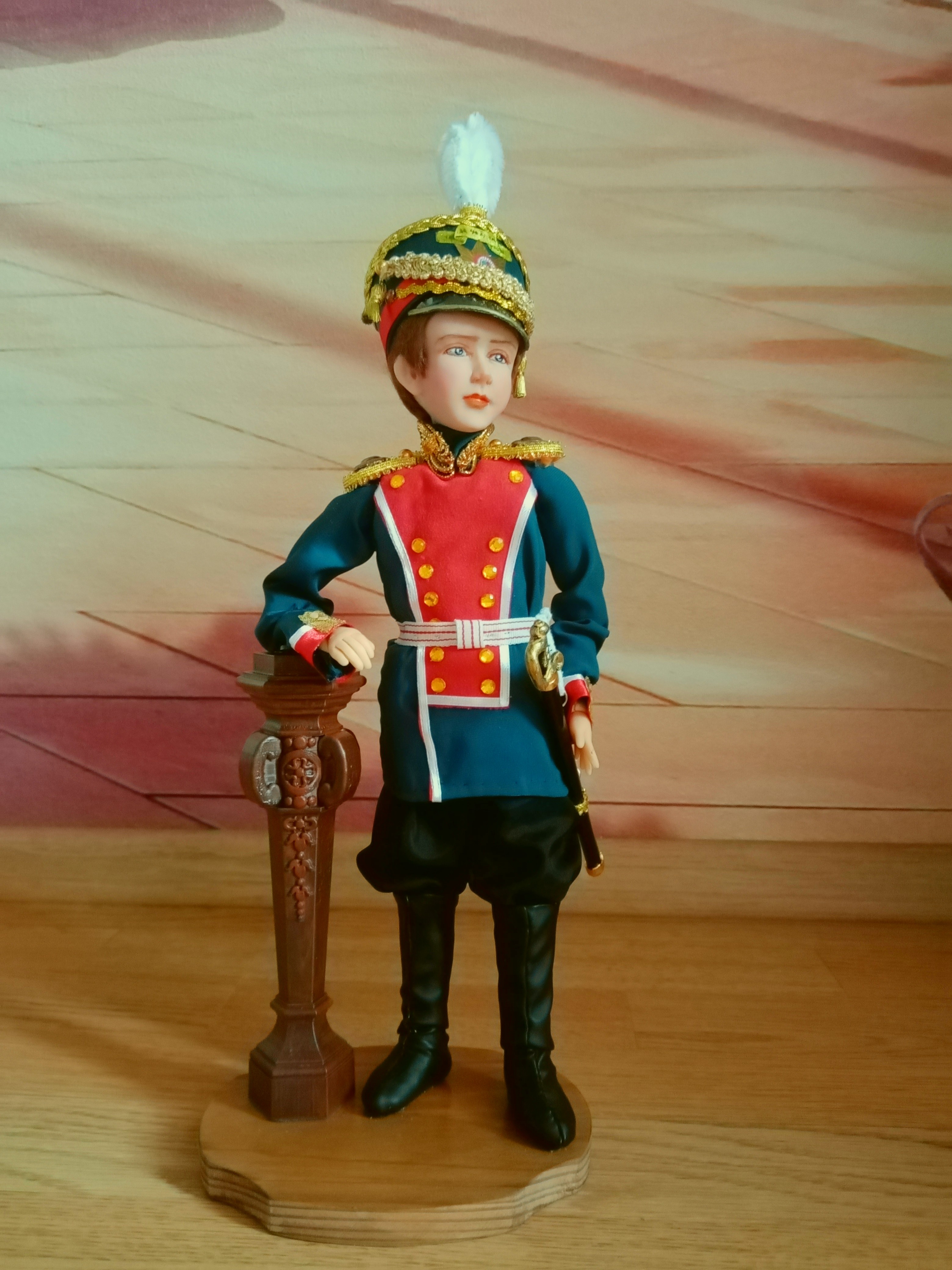Кукла-статуэтка, Цесаревич Алексей Николаевич. Ручная работа. Голова, руки и ноги из полимерного запекаемого пластика, тело на проволочном каркасе, мягкое(синтепон, ткань) Голова поворотная. Головной убор(кивер) снимается. Статуэтка прикреплена к деревянной подставке. Высота с кивером - 37 см. Размер подставки - 15х10х1 см