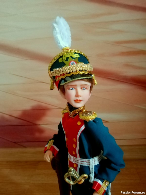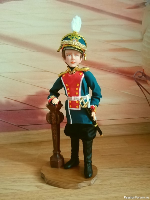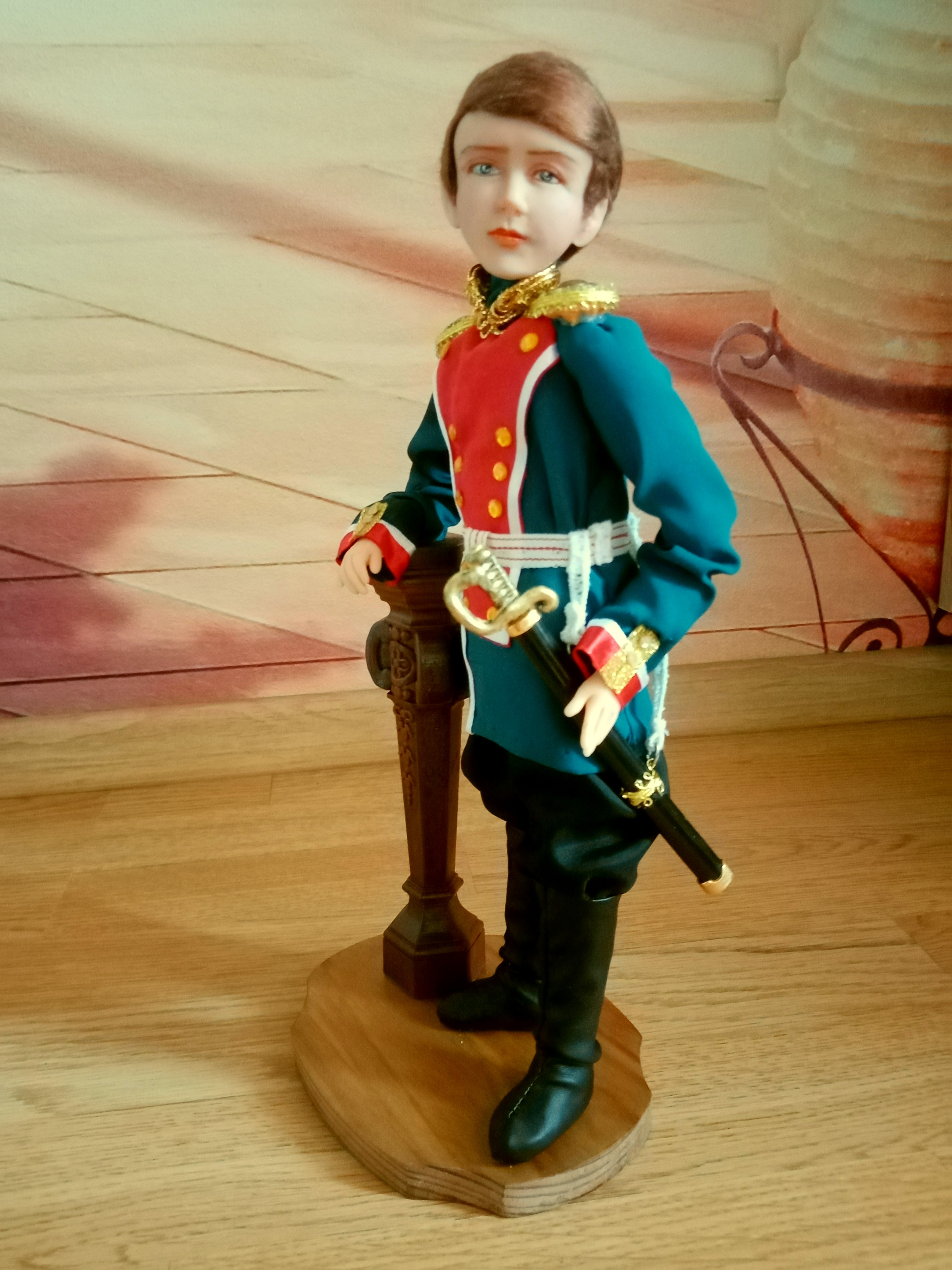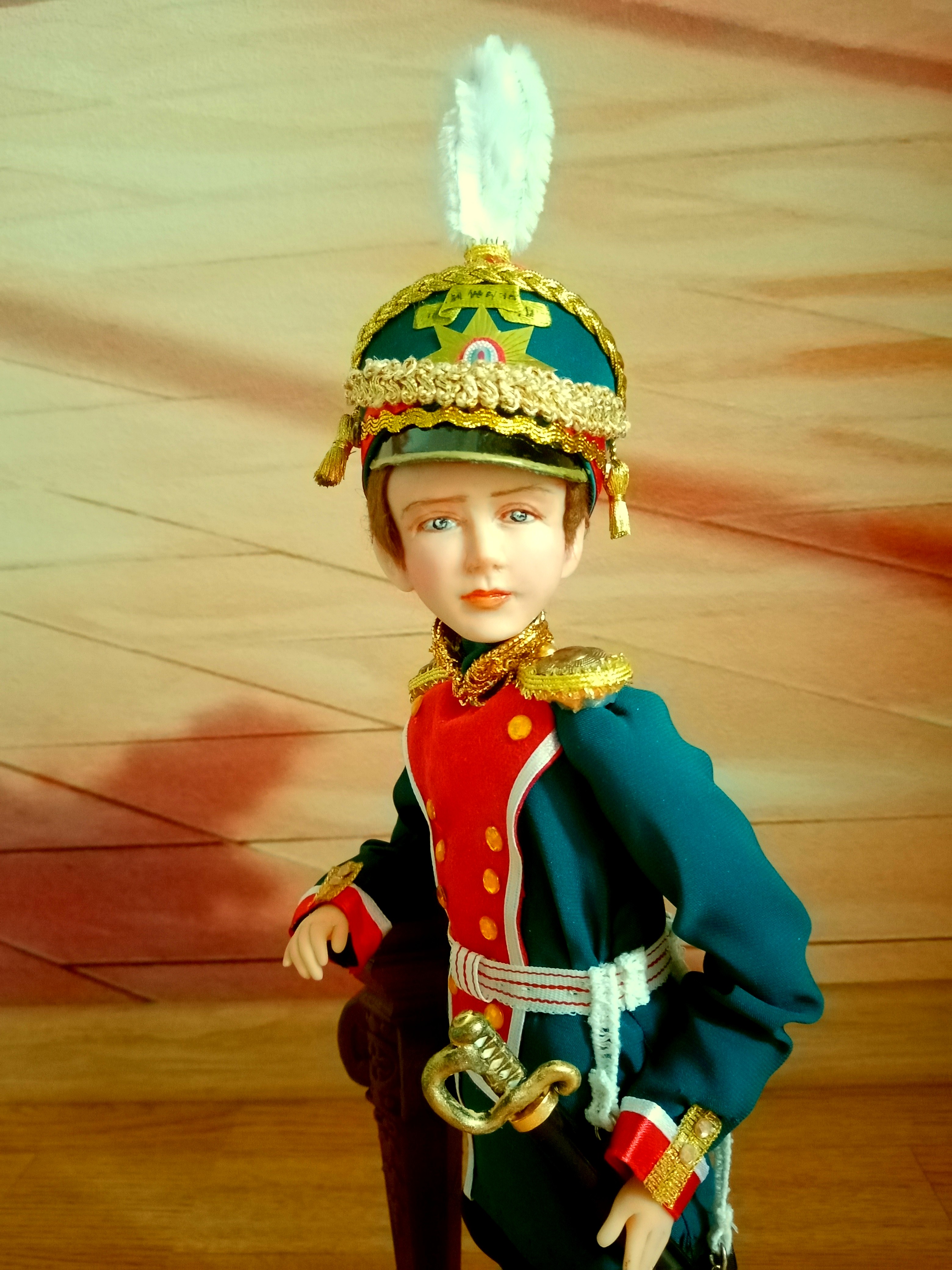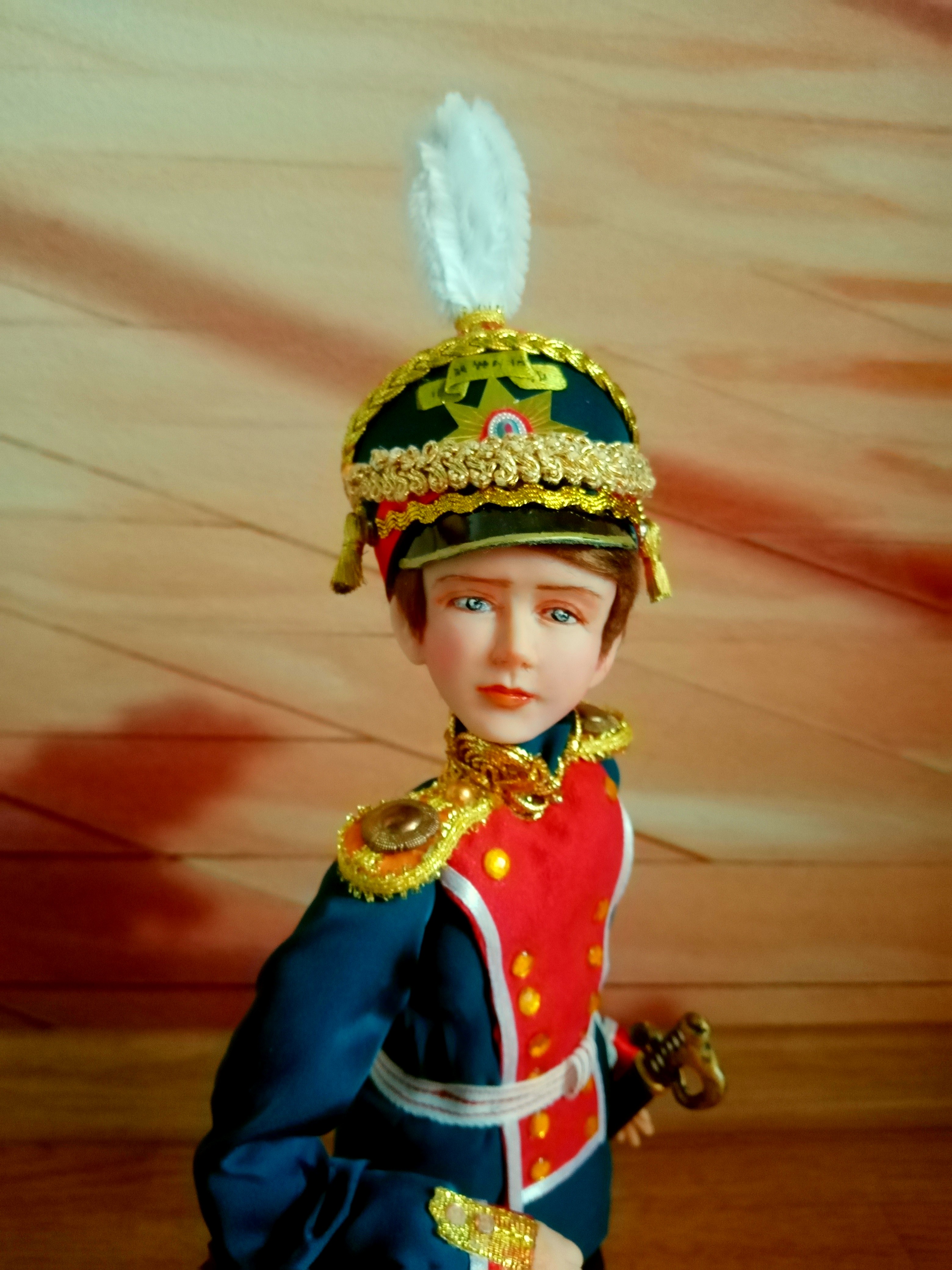 Кукла-статуэтка, Цесаревич Алексей Николаевич. Ручная работа. Голова, руки и ноги из полимерного запекаемого пластика, тело на проволочном каркасе, мягкое(синтепон, ткань) Голова поворотная. Головной убор(кивер) снимается. Статуэтка прикреплена к деревянной подставке. Высота с кивером - 37 см. Размер подставки - 15х10х1 см