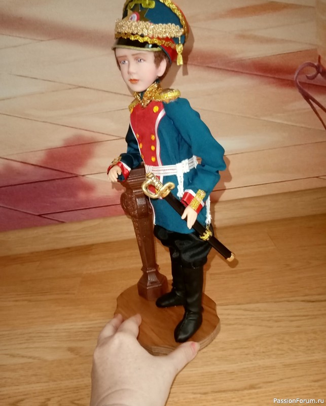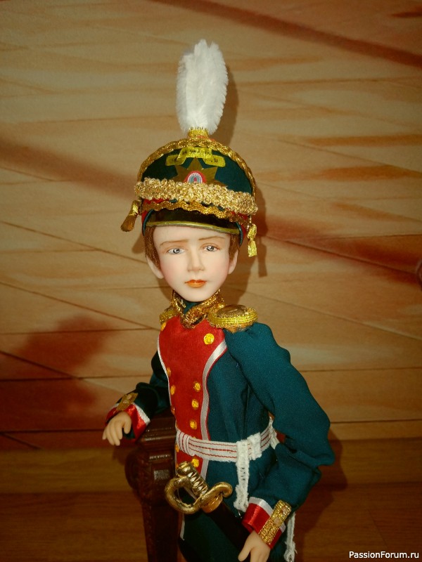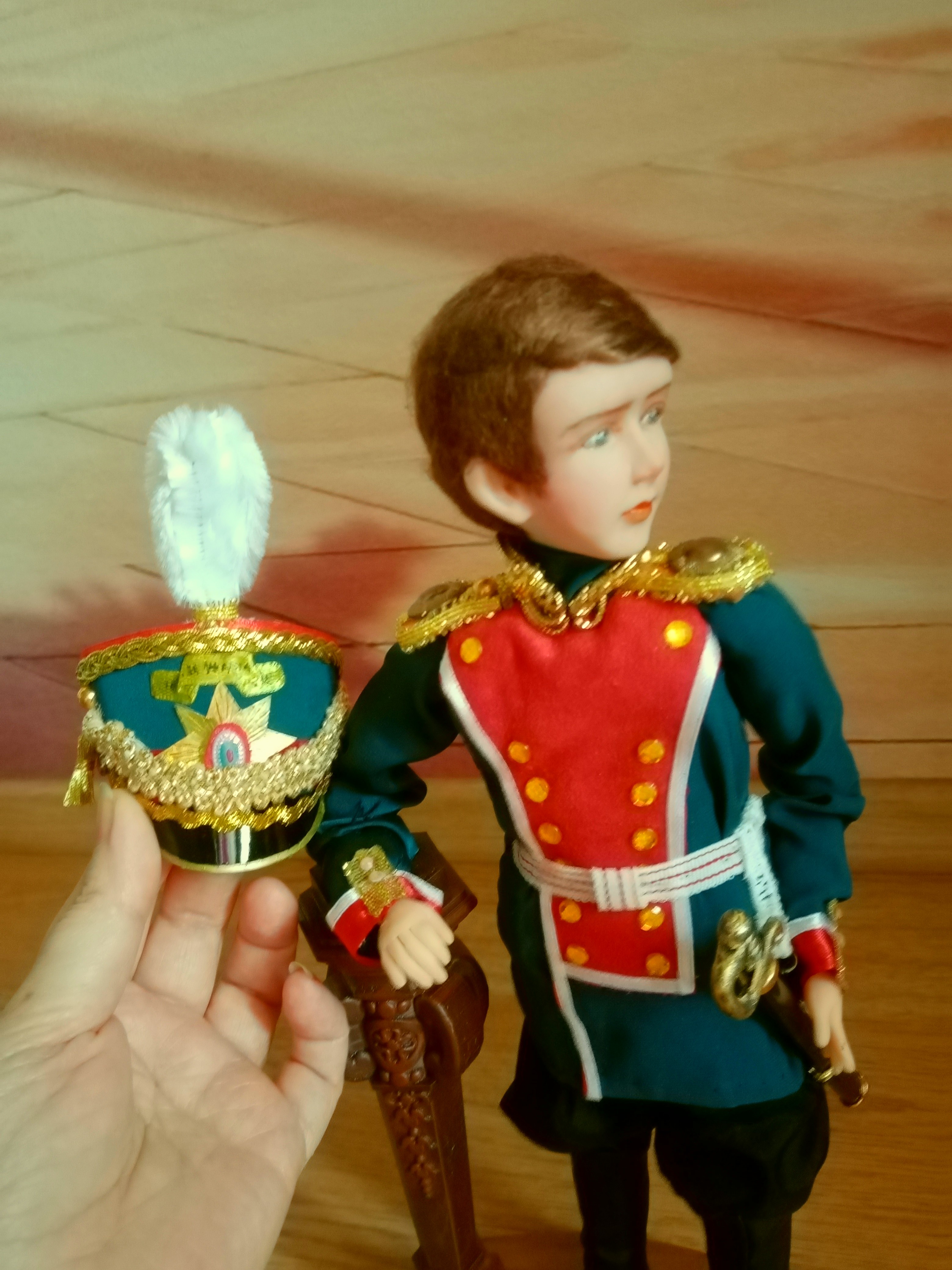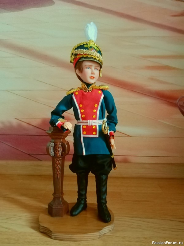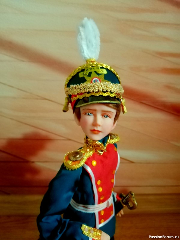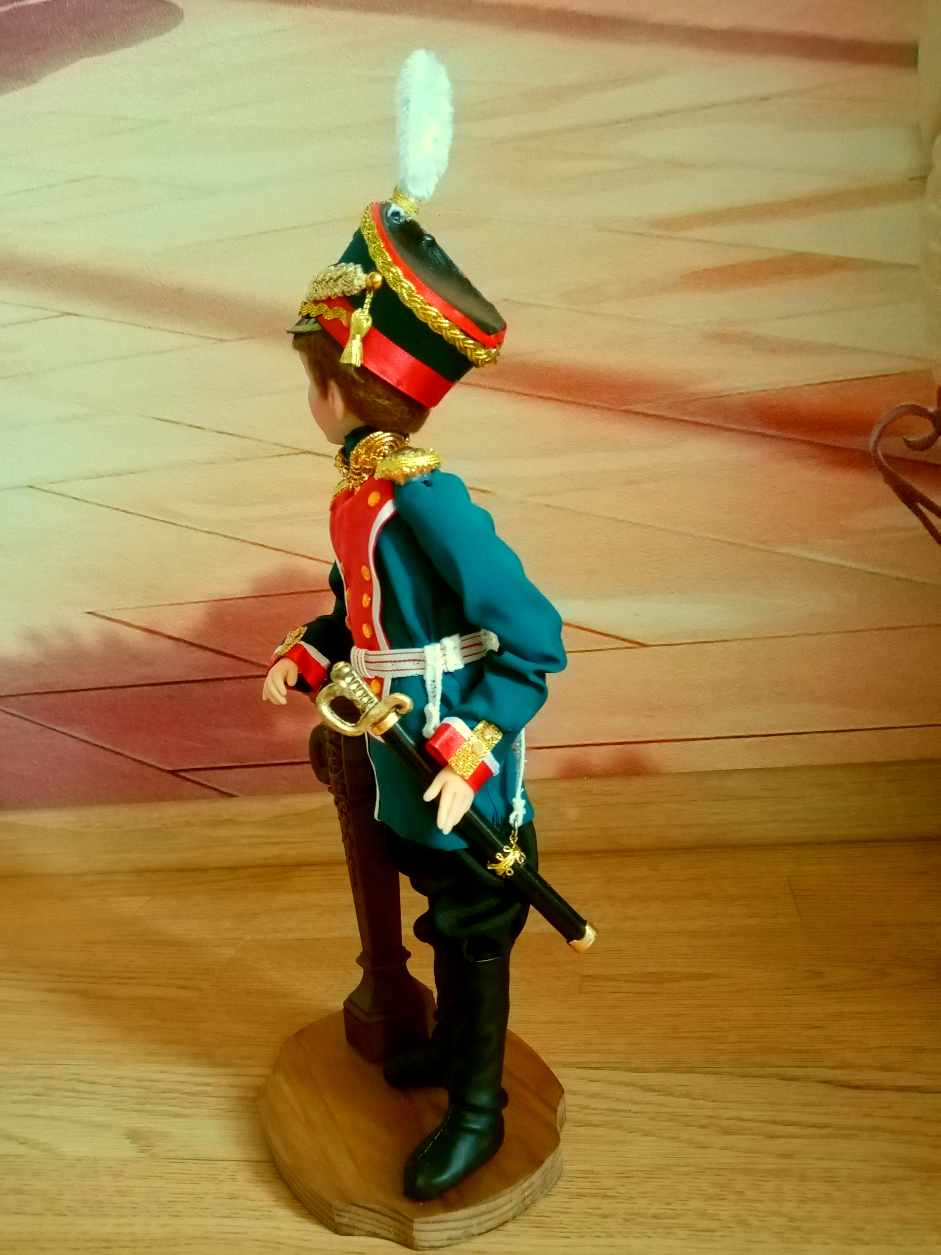 Кукла-статуэтка, Цесаревич Алексей Николаевич. Ручная работа. Голова, руки и ноги из полимерного запекаемого пластика, тело на проволочном каркасе, мягкое(синтепон, ткань) Голова поворотная. Головной убор(кивер) снимается. Статуэтка прикреплена к деревянной подставке. Высота с кивером - 37 см. Размер подставки - 15х10х1 см