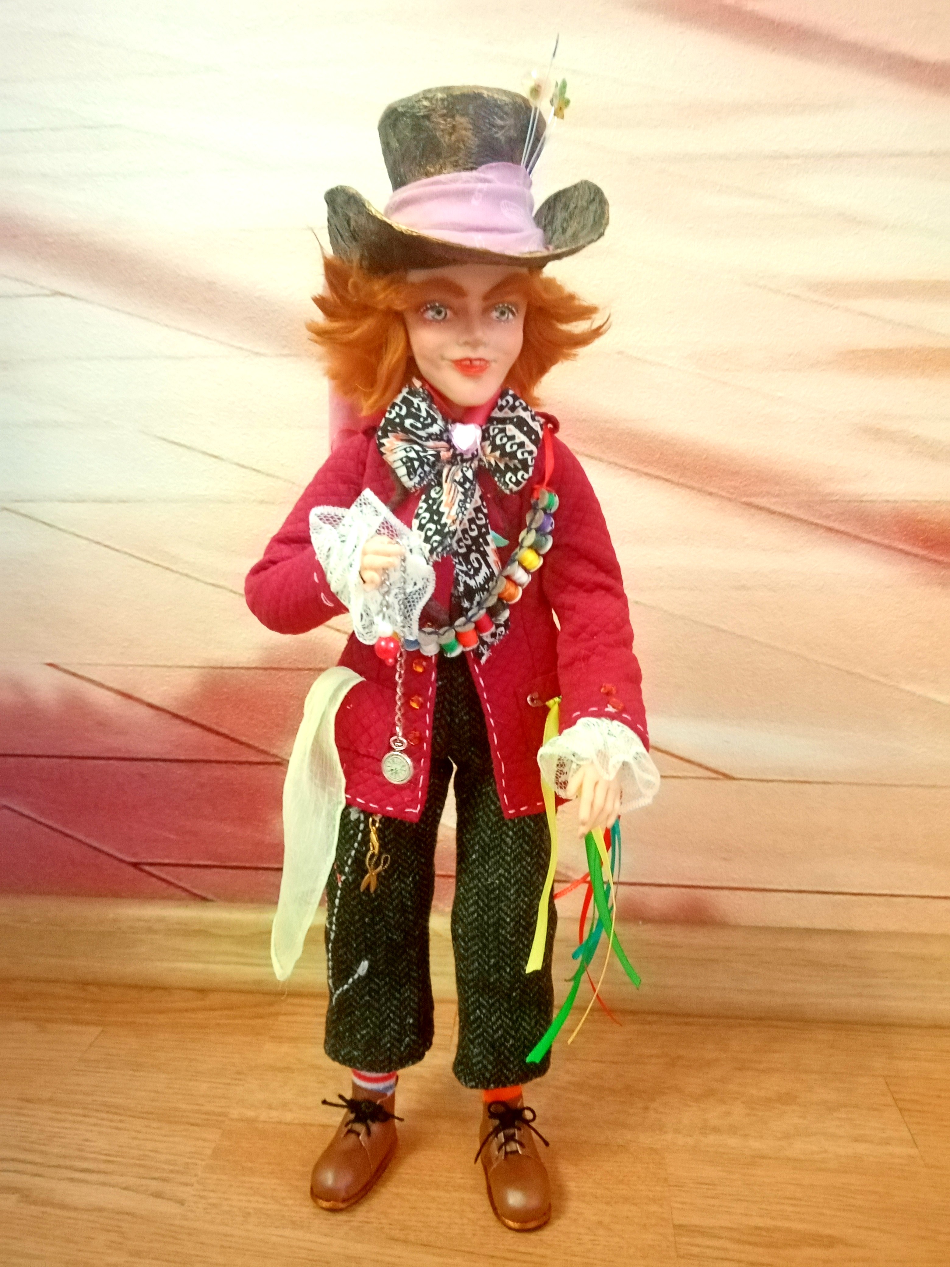 Кукла Шляпник из сказки "Алиса в стране чудес". Сделан на заказ. Ручная работа. Тело на проволочном каркасе. Руки, ноги и голова подвижные, из полимерного запекаемого пластика. Высота со шляпой примерно 40 см. Если хорошо уговорить)) может и сам постоять, но в основном предпочитает стоять у стеночки или сидеть)) Одежда, обувь и шляпа НЕ снимается. Шляпа - из папьемаше
