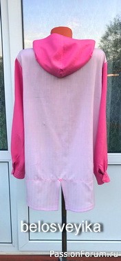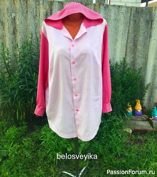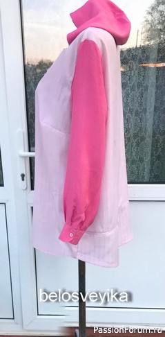 5,Из женской блузки выкроила капюшон, пришила в горловину мужской рубашки.
