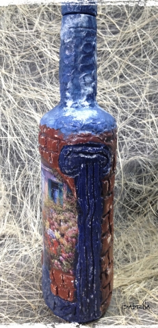 Изабелла, как я вас понимаю недавно сделала бутылочку, использовала текстурную пасту, очень хотелось попробовать новый материал, потрогать на ощупь, посмотреть и узнать каков он работе. Здорово, когда есть желание и возможность реализоваться! Ваша бутылочка замечательная, только мне кажется, что пилястры здесь лишние. А сочетание кладки и сам рисунок — супер!!! Свою бутылочку никак не могу сфотографировать, позже покажу свою кладку.