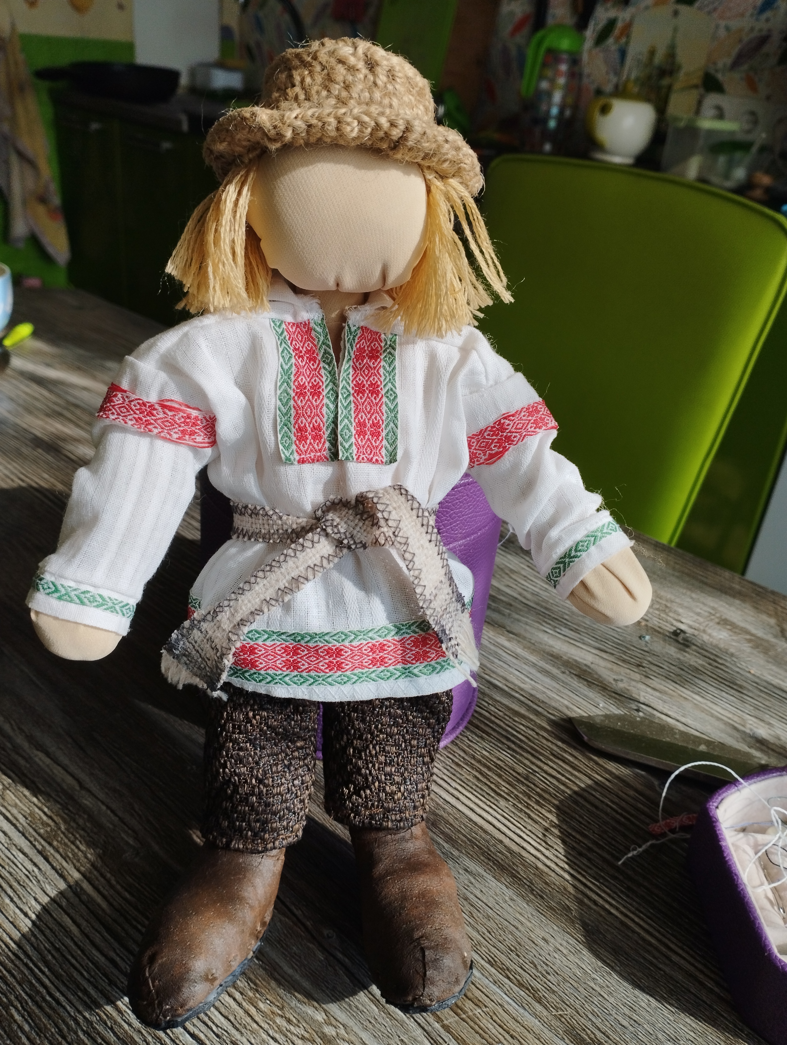 Попросила меня учительница моей дочери сделать куклы в национальных одеждах. Нашла я мастер класс в интернете и принялась творить. Как оказалось все не так то просто, но по-моему получилось неплохо. Каркас проволочный, обмотан синтепоном и зашито мебельной тканью. Одежда из ситца, мебельной ткани. Синяя ткань пальтовая, сапоги сшиты из кусочков кожи и покрашены, лапти и шляпа связаны из джутового шнура. Лица рисовать не умею, учительница сказала сама нарисует.