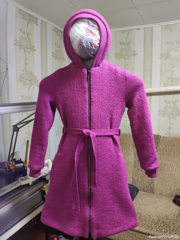 Пальто связано на вязальной машине Бразер 940/868. Переплетение - жатый жаккард из белорусской полушерсти 32/2 в 2 сложения. Подклад из флиса