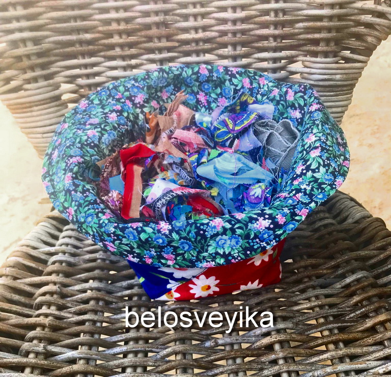 Я нашла применение этой корзинке, поставила ее на рабочий стол, рядом с машинкой Теперь, когда ровняю, подрезаю, крою, скидываю туда маленькие обрезки, для будущей пиццы.Когда наполняется, можно высыпать в другой место или уже пора шить пиццу.