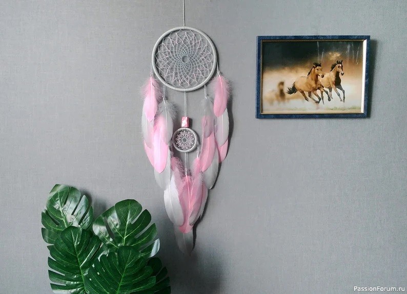 Большой ловец снов с перьями гуся. Диаметр 18,5 см. Высота 65 см. Стоимость 800 плюс 360 почта.