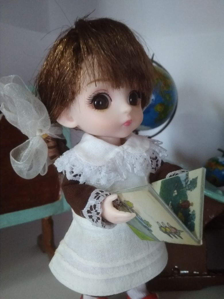 Смотрела фотографии в инете, чтоб вспомнить, как его держат. Но увы, ручки-то кукольные далеко не так мобильны, как нам хотелось бы (всё падает и валится). Так что, простим первокласснице промашку со смычком (я сразу и призналась, что тут у Алисы проблемка!