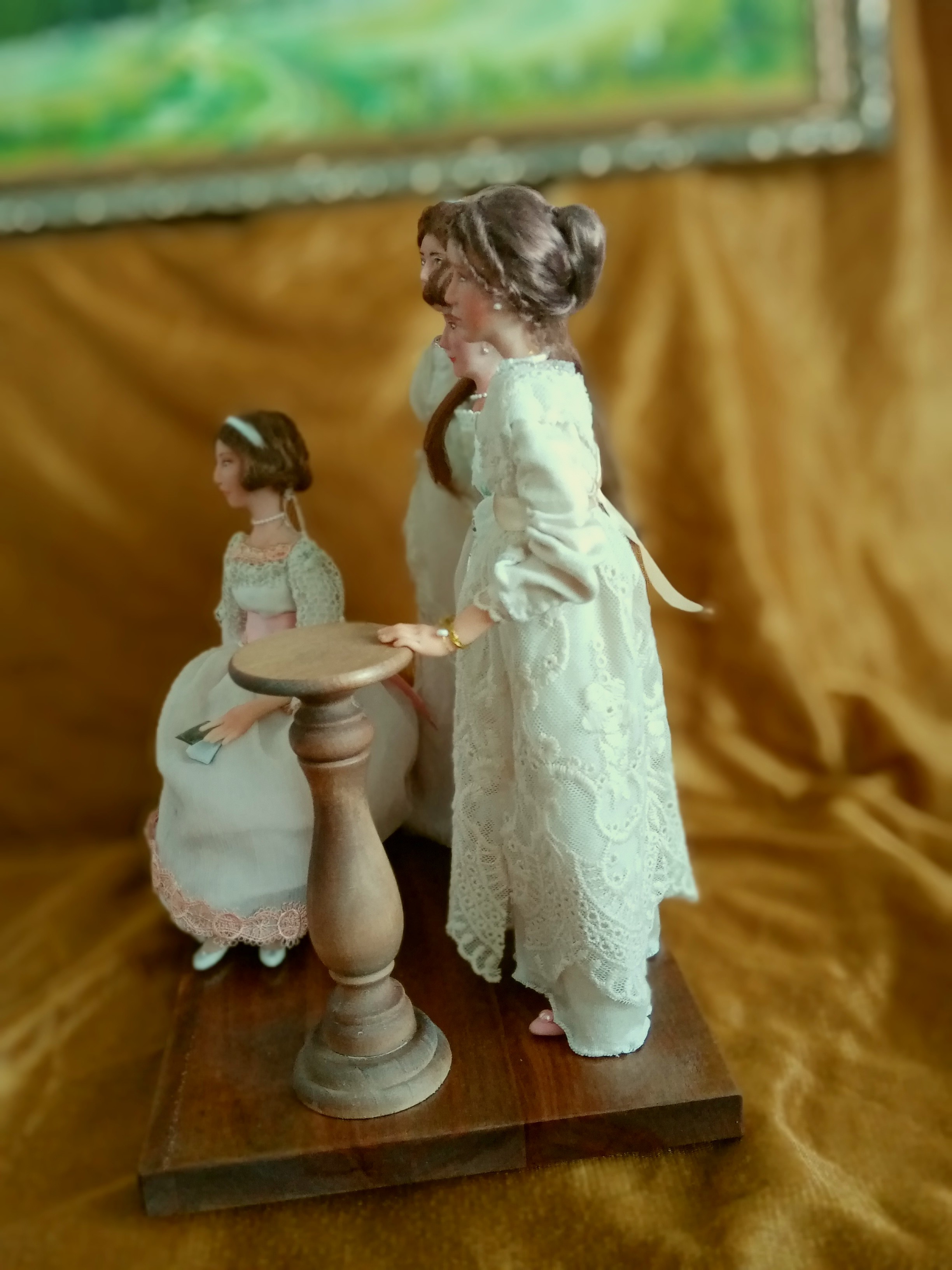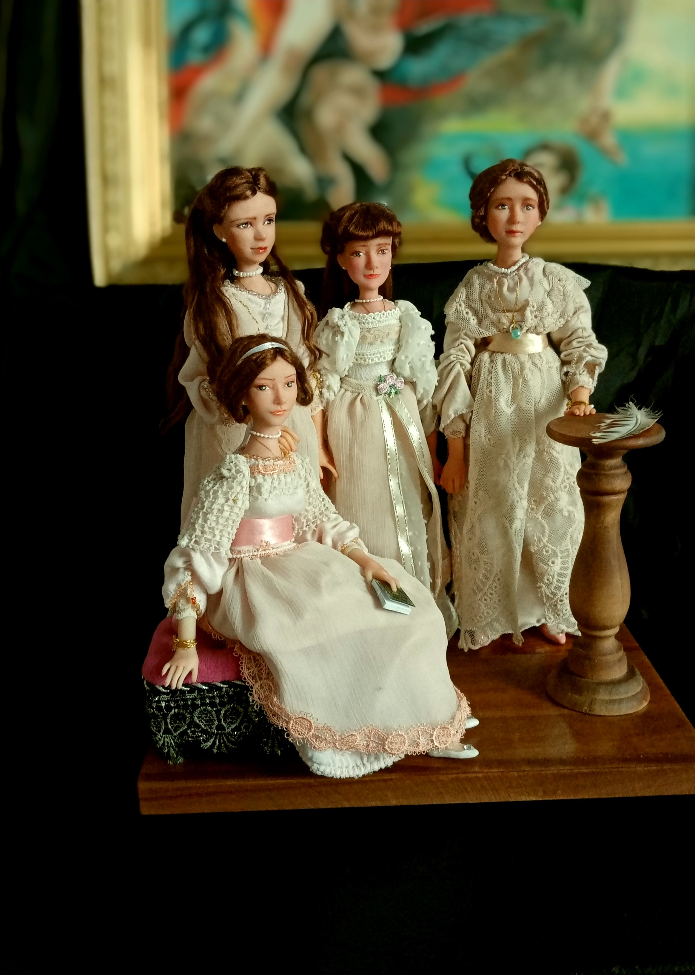 Композиция- Княжны Романовы. Ручная работа, ручная лепка, шитьё. Фигурки сделаны из (запекаемого пластика- голова, руки и ноги)ткани, синтепона, проволока, тело мягкое- синтепон, ткань- проволочный каркас. Волосы из вискозы . Руки на ниточном креплении. Фигурки и (колонна деревянная) прикреплены к деревянной подставке(не снимаются)