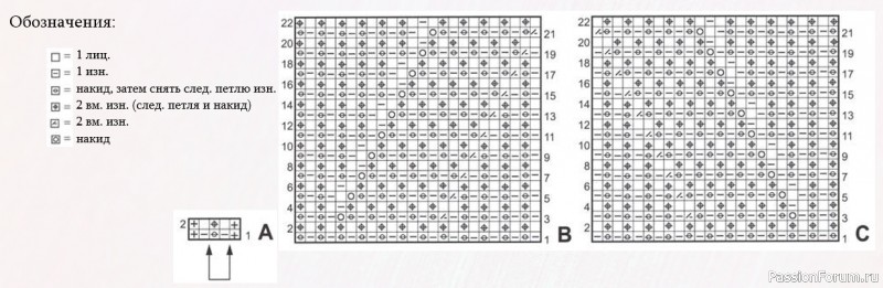Узор со сдвигом «Коса»: вязать согласно схеме В или С. Цифры с правой стороны схем обозначают ряды ЛС, а цифры с левой стороны схем обозначают ряды ИС. Повторять 1 - 22 ряды.