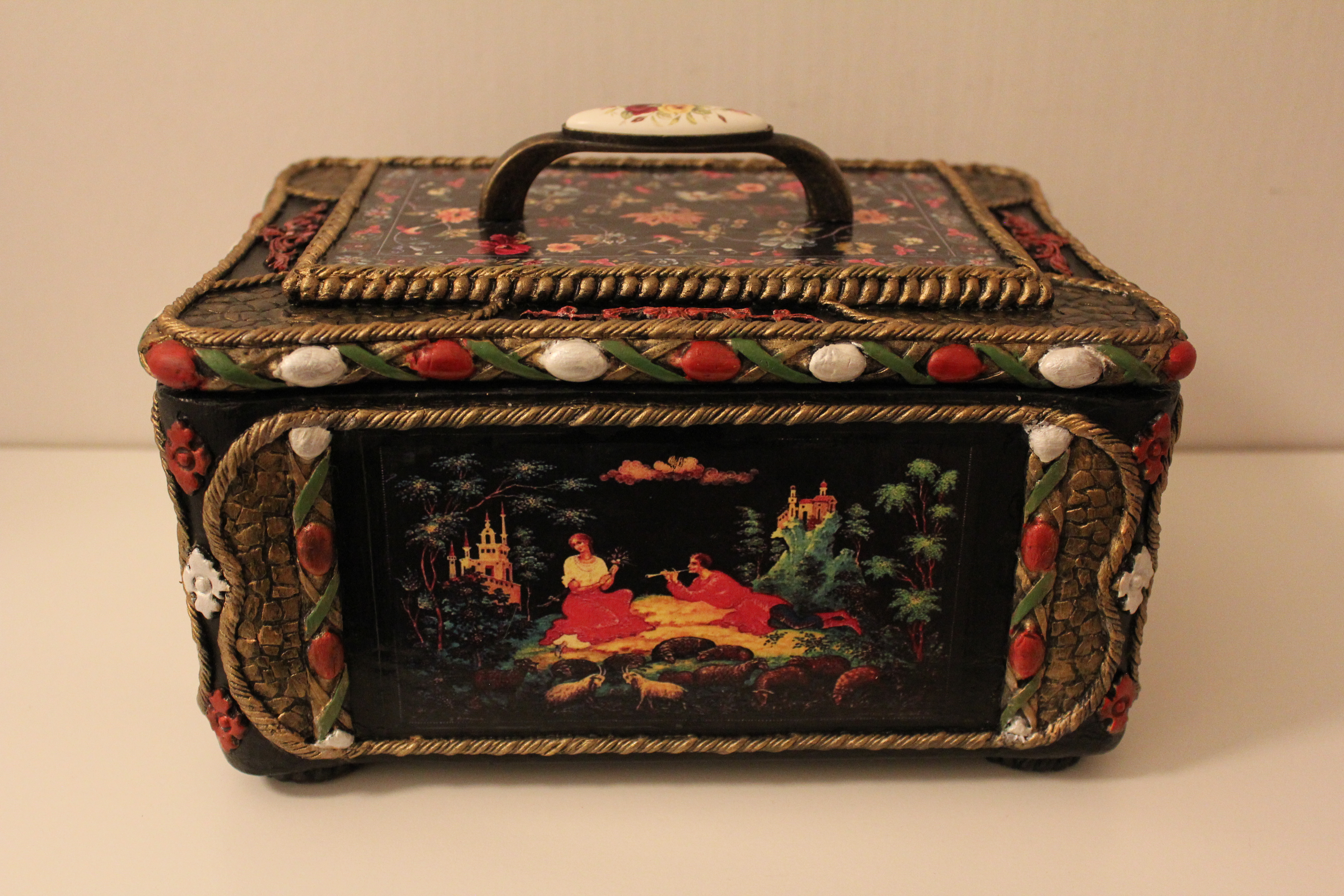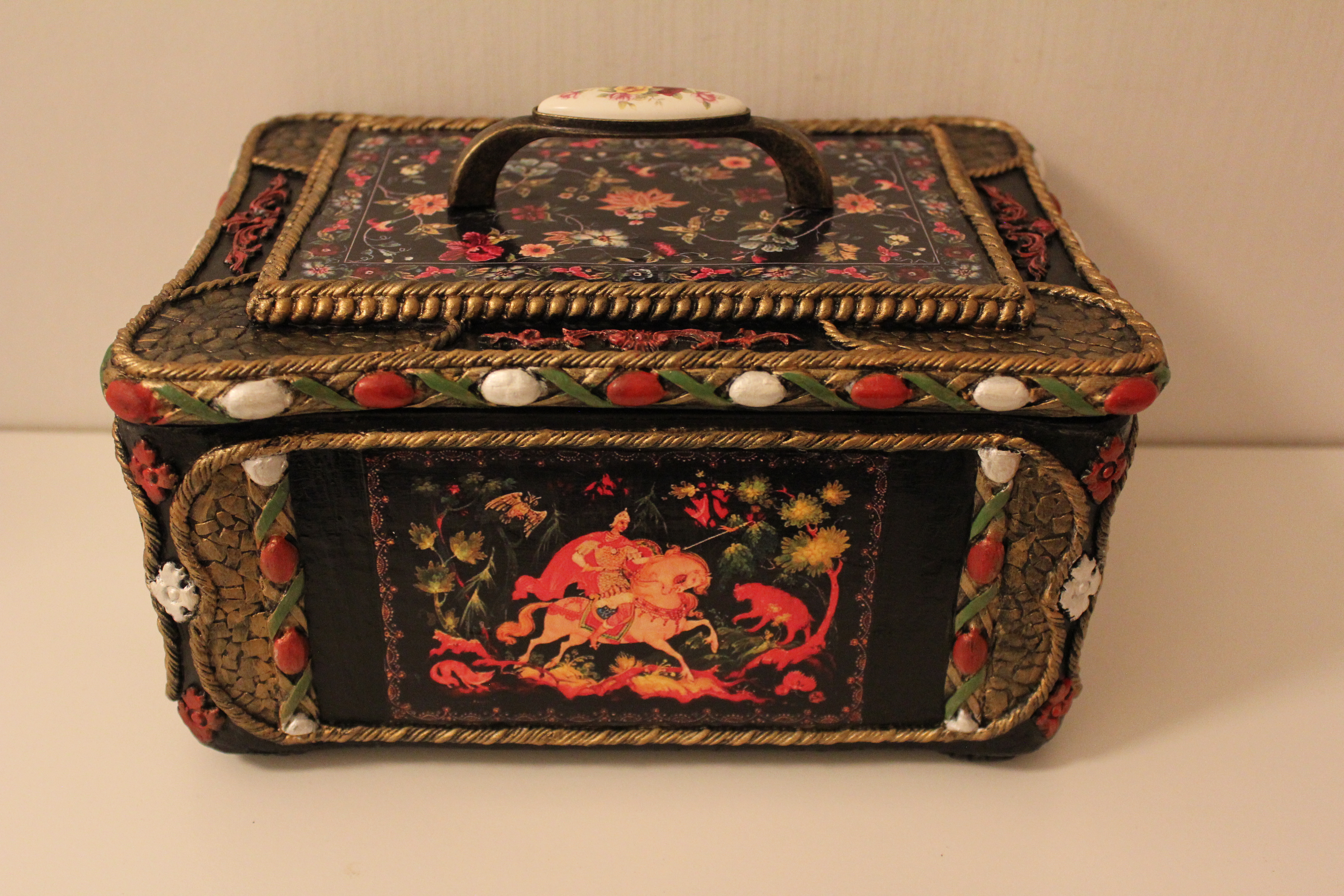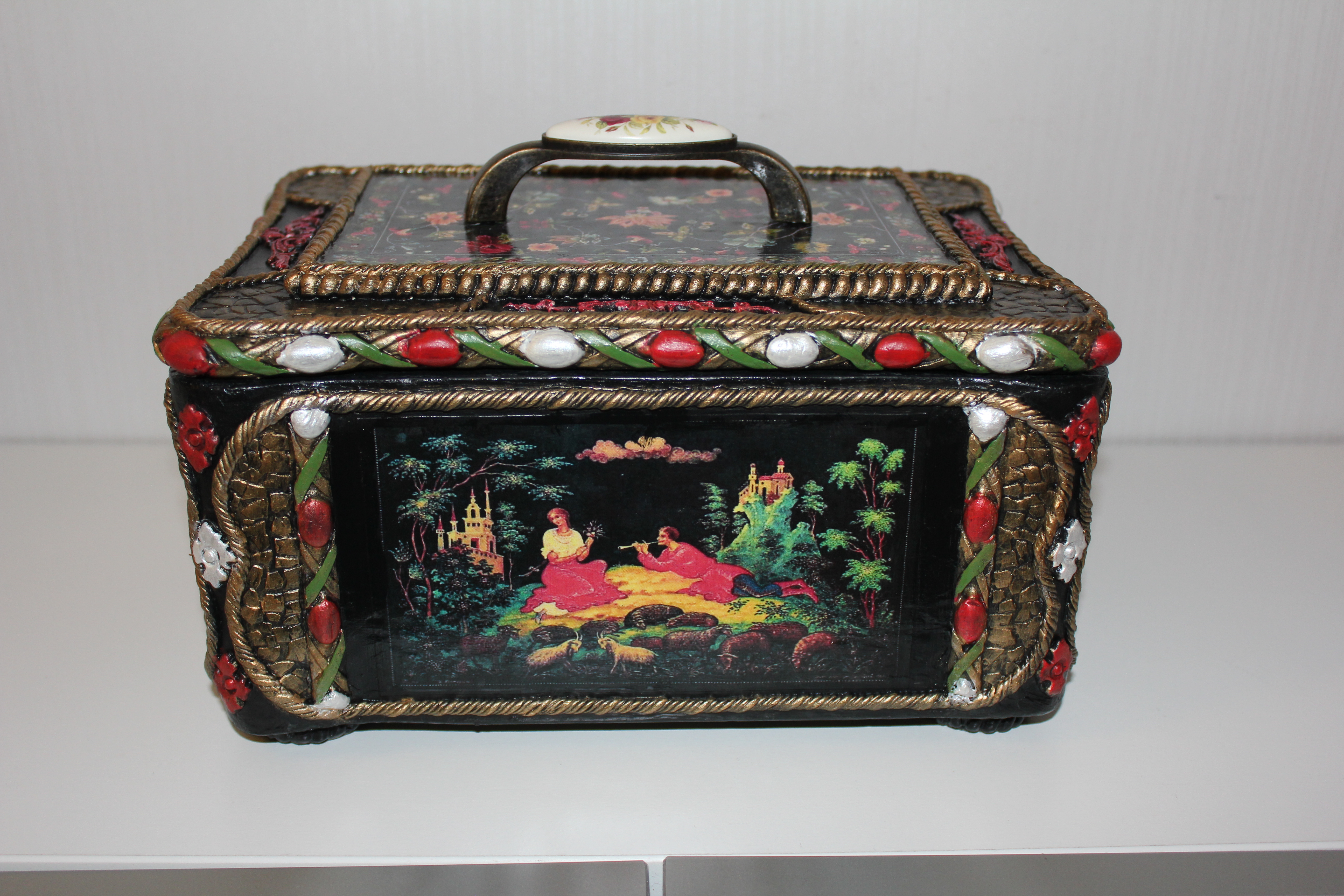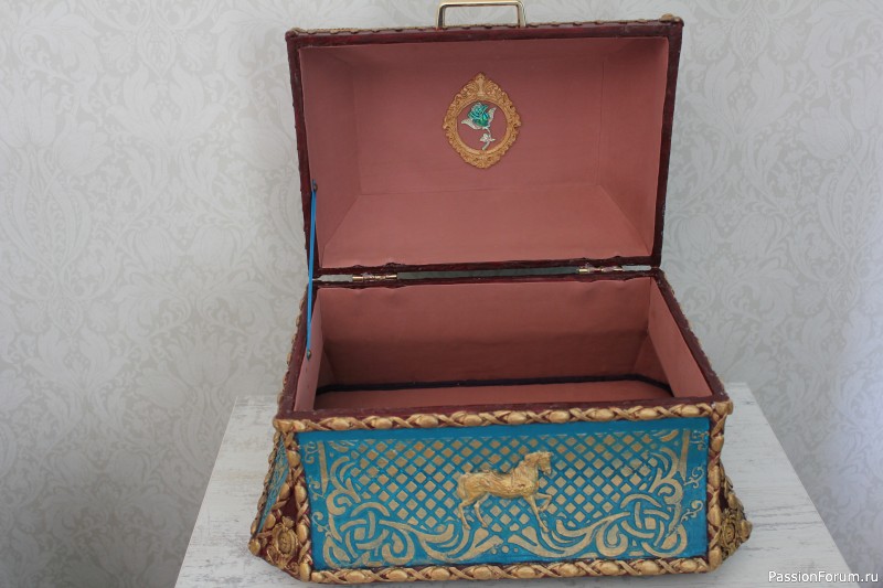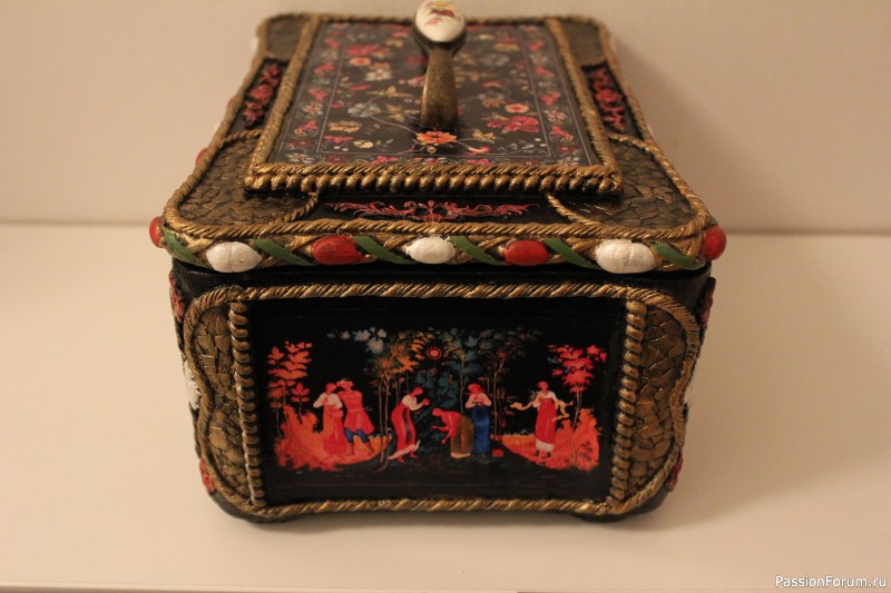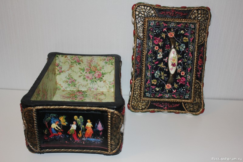 Классные сундучки! Поражает изысканность форм всех трех. И оформлены они в стиле. Первый сложный царственный, второй «Палех» такой уютный внутри, а «кованный» строгий, «тяжелый». Миная, как всегда