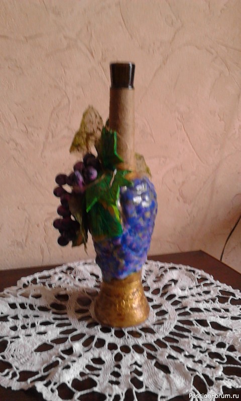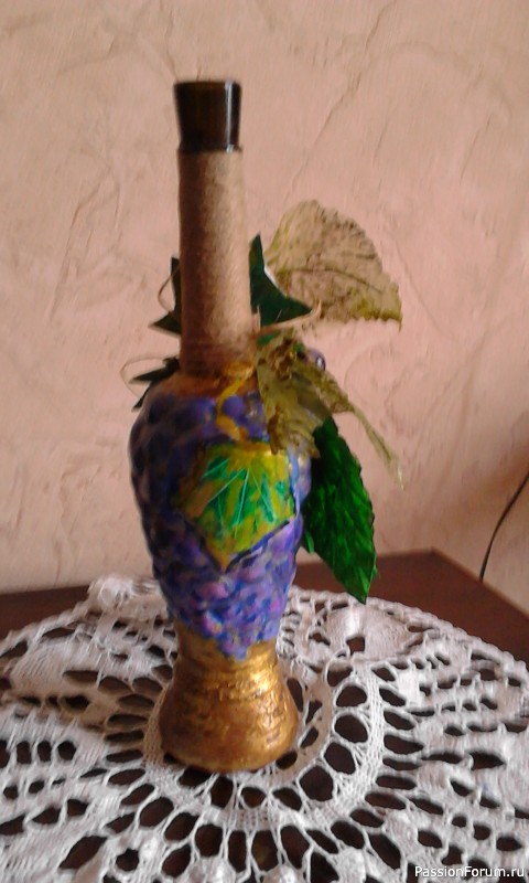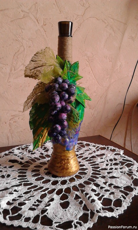 Сама по себе бутылка была в форме виноградной грозди, нанесла массу папье-маше, покрасила, покрыла лаком, задекорировала готовой гроздью винограда (но предварительно над ней поработала, перекрашивала), листьями из органзы, некоторые листики слепила из полимерной глины, горлышко обмотала джутом
