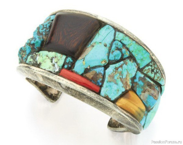 Золотой браслет, инкрустированный бирюзой, деревом, кораллом и тигровым глазом, Чарльз Лолома, США, ХХ век.