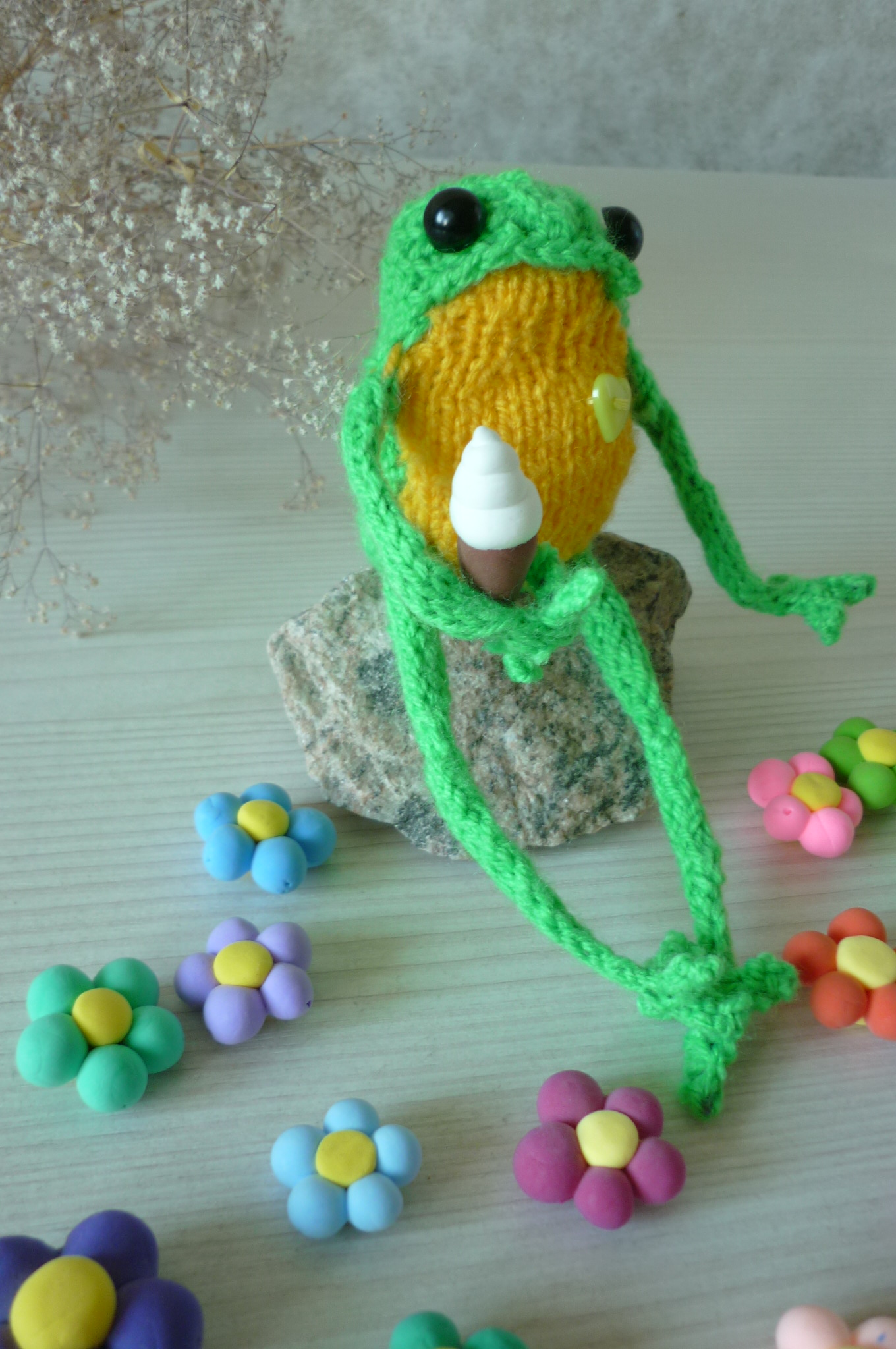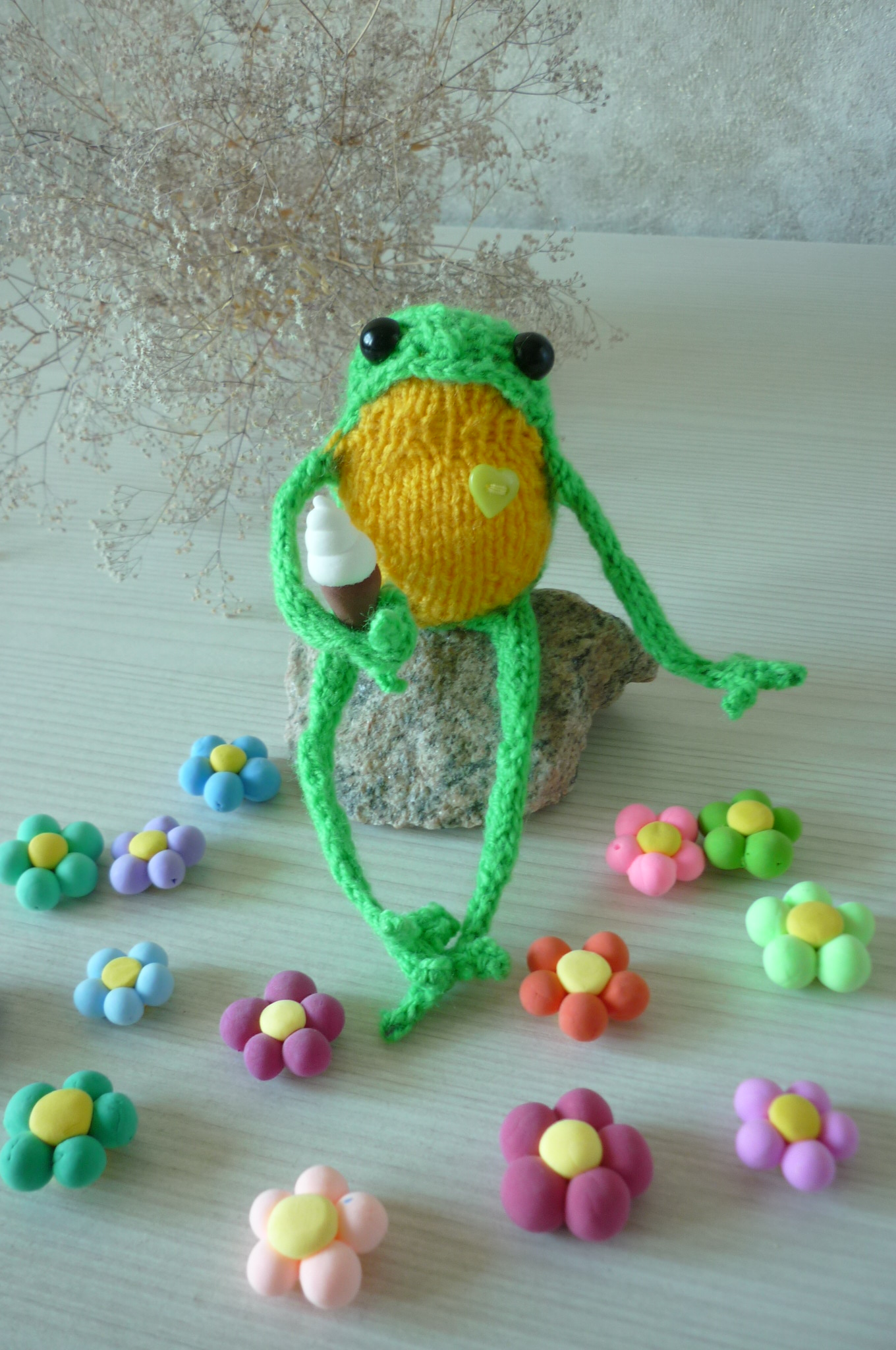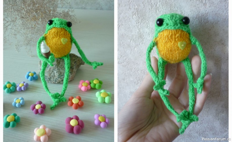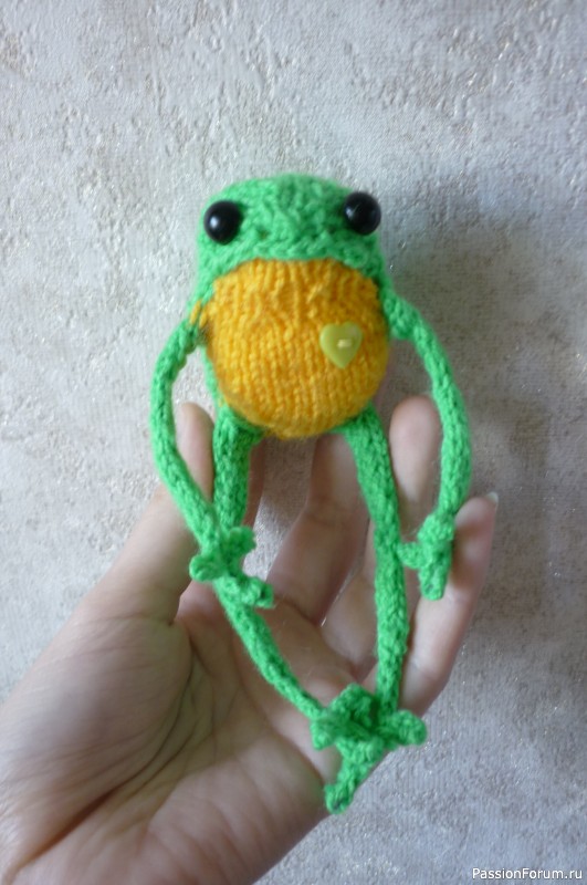 Лягушонок связан спицами, лапки на проволочном каркасе, на груди сердечко