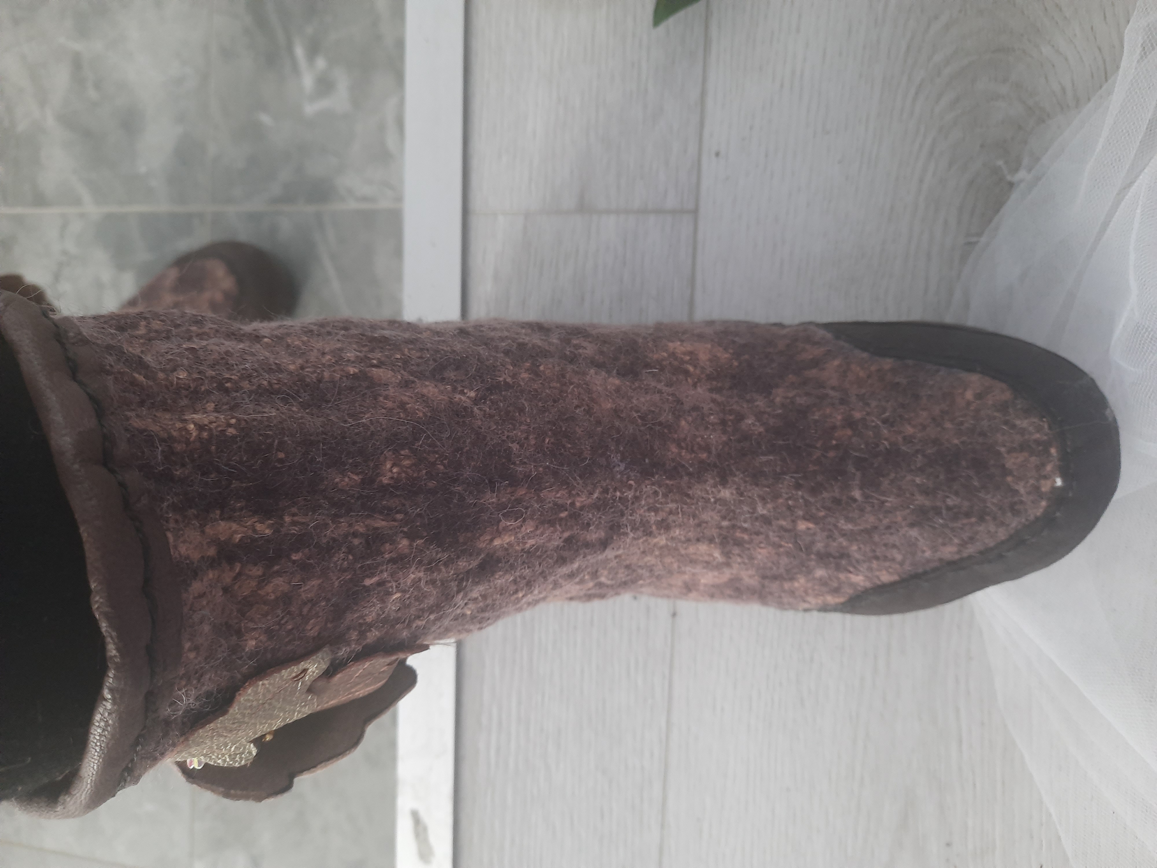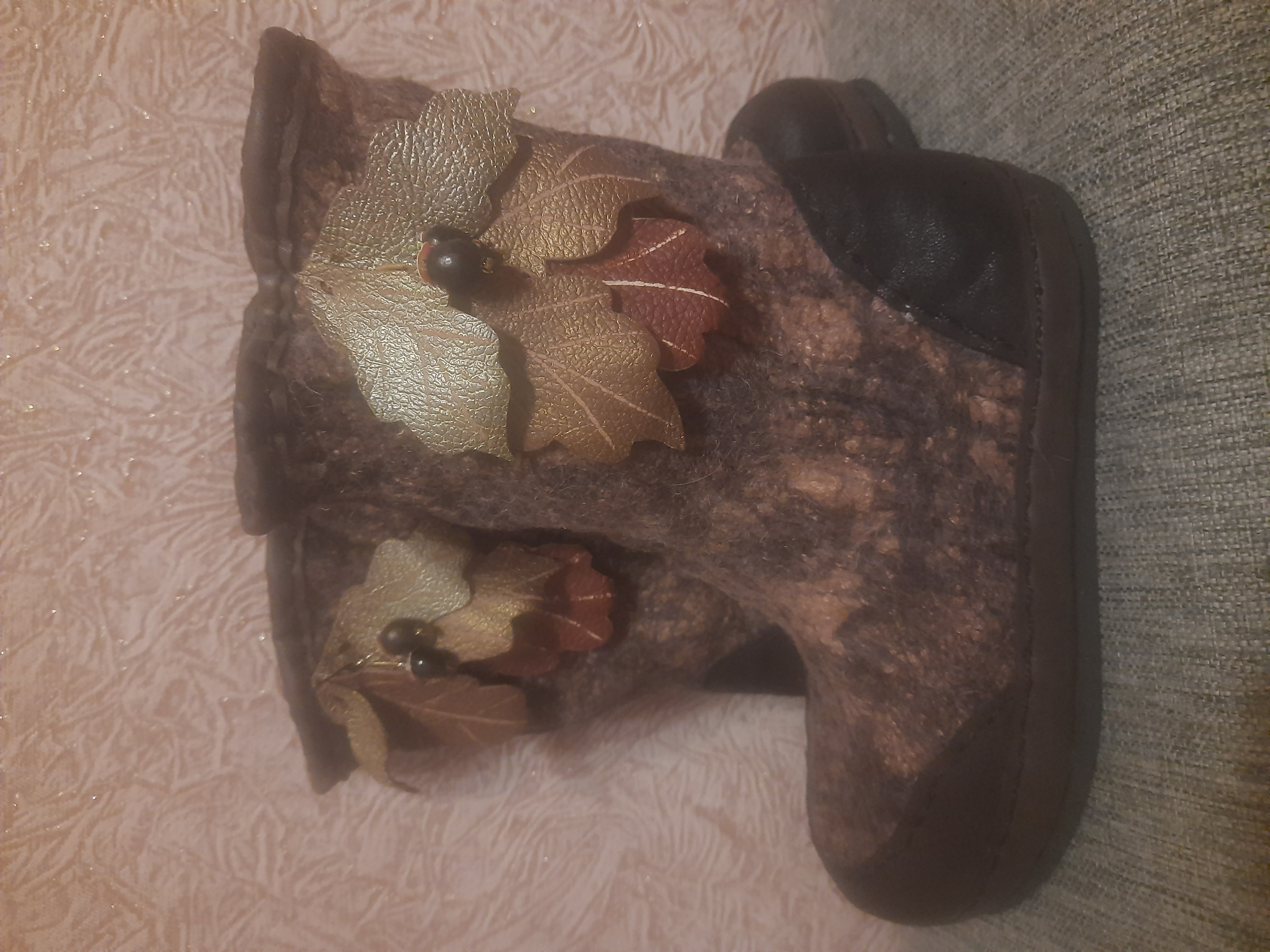Привет форумчанки.Сваляла себе сапожки.Отделка замшей темно коричневой и кожей коричневой.Подошва отрезная из пласта ЭВА и потом бочки зашкурены.Приклеена подошва и прошита . Прошивка сделана в "луночку " (углубление) резачком для кожи. Листочки кожа натуральная крашенная мной.Далее между слоёв протянута резиночка для плотного облегания.