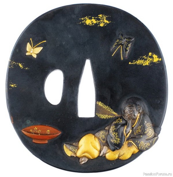 Цуба из сплава сякудо, инкрустированная золотом, с изображением спящей фигуры, мастер Оцуки Корин, первая половина XIX века.