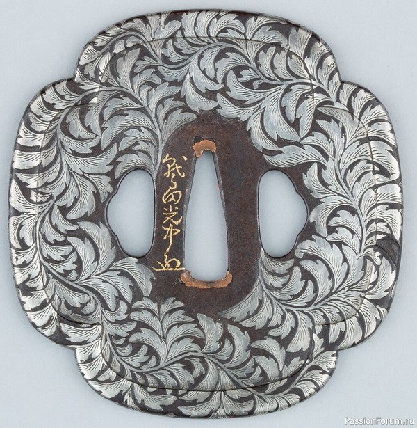 Цуба из сплава сякудо, инкрустированная золотом, высота 7,4 см, мастер Сунагава Мао-Ёси, начало XIX века, из коллекции музея Метрополитен.