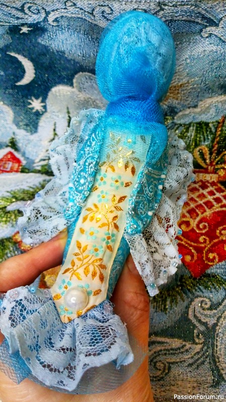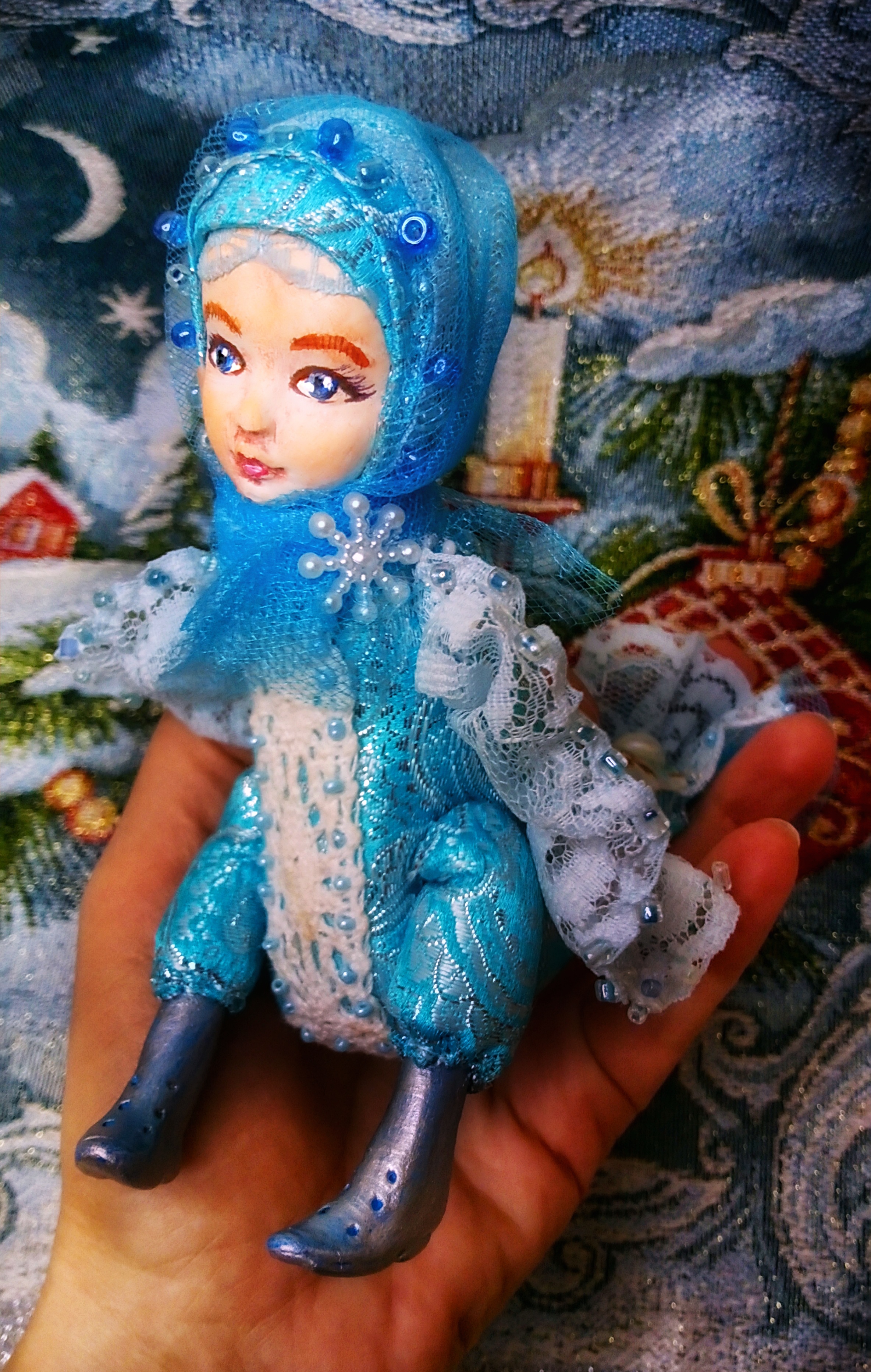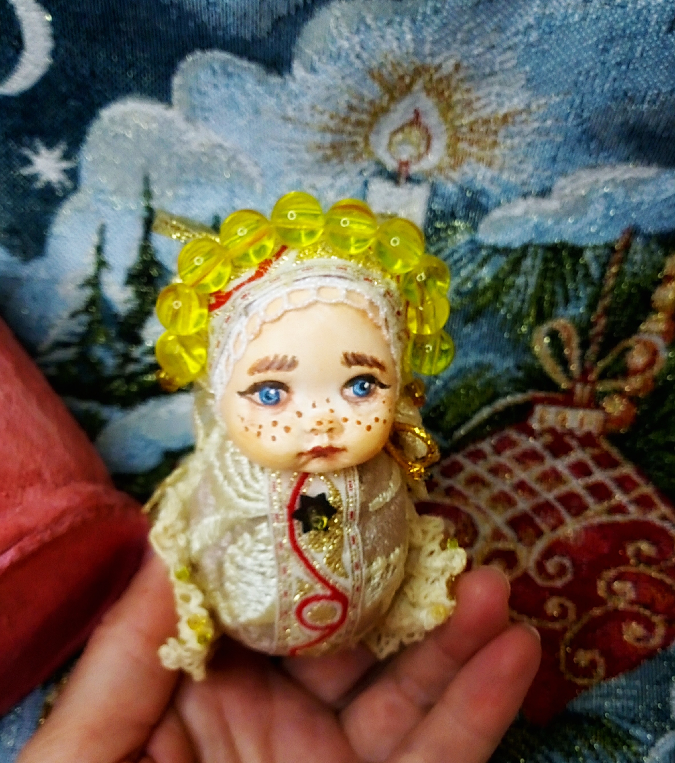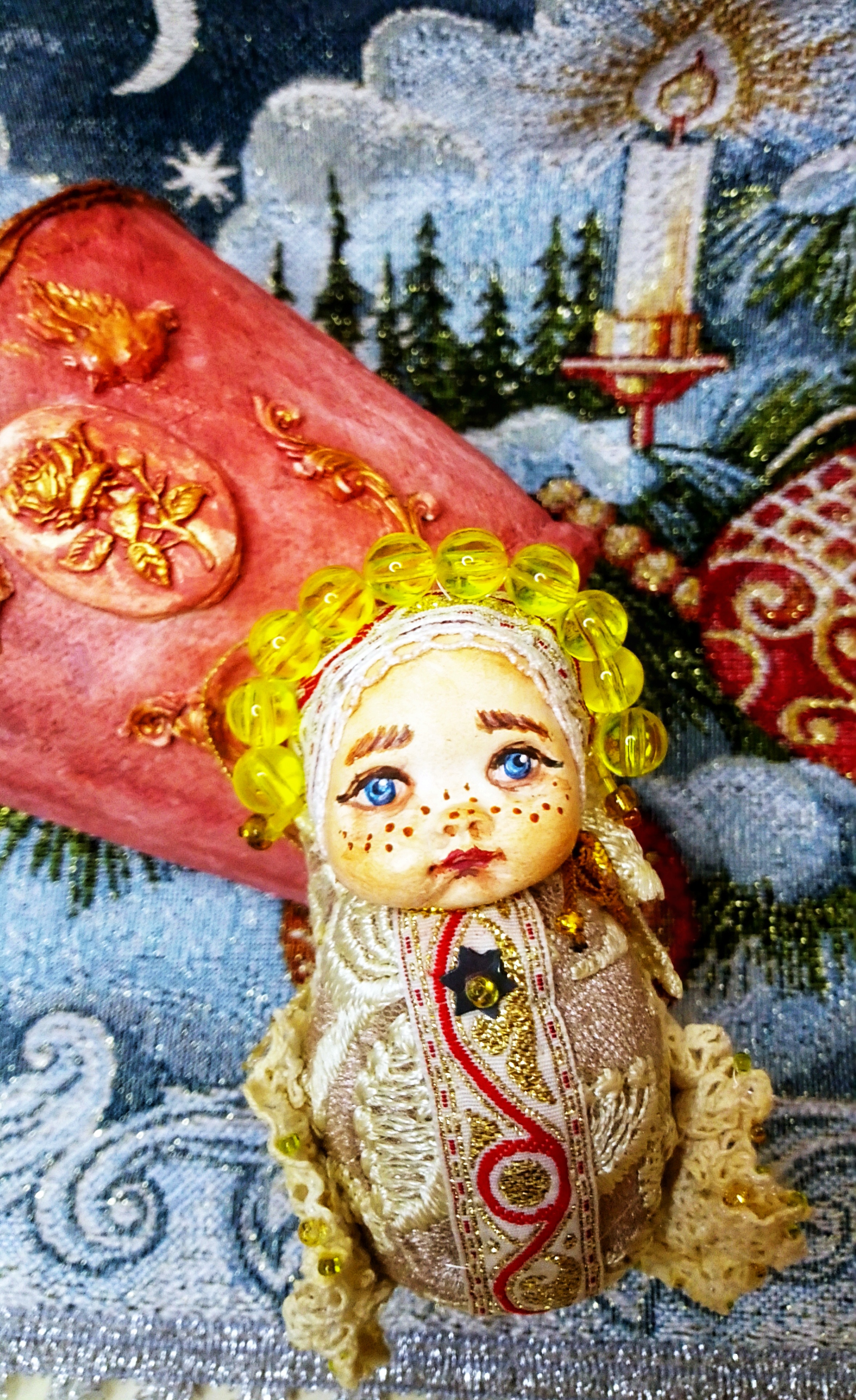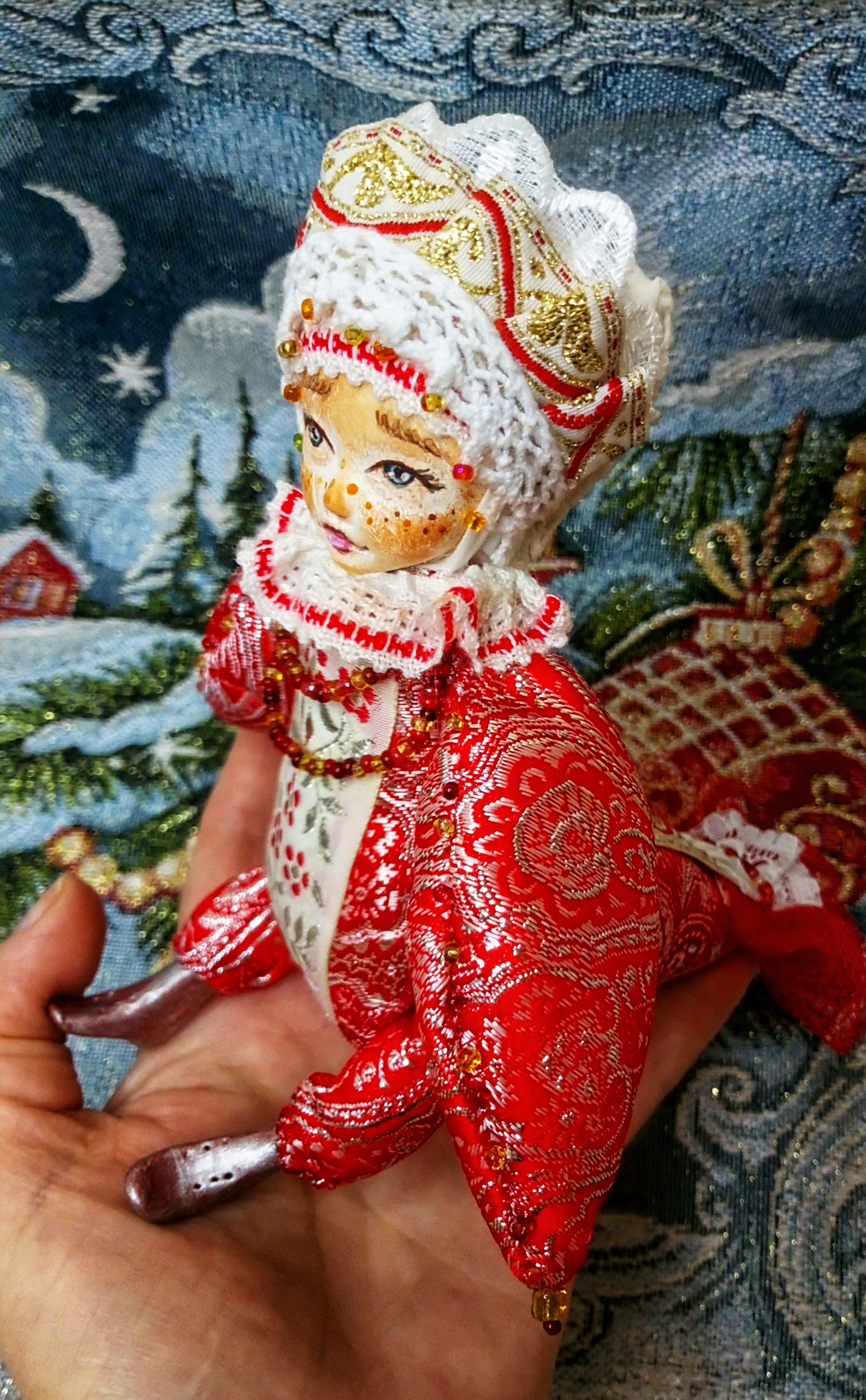 Интертерная кукла. Ручная работа. Личико и сапожки из глины. Парча, кружево, бисер