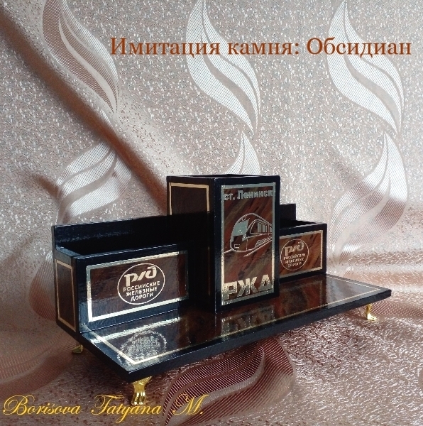 Татьяна, прекрасная работа! Оригинальный подарок сыну. Сразу видно, сколько любви вложено в него ( и в сына, и в подарок ). Любимому сыну от любящей матери. Органайзер смотрится как творение из камня, тяжелое, основательное, брутальное. Сразу понятно, что предназначено мужчине. Это не всегда удается мастеру, а вам удалось. Браво! Из всего этого выбиваются хлипкие ножки. Мне они видятся тоже основательными, прямоугольными или квадратными, обсидиановыми или в цвет надписи «Ленинск». На моем мониторе ножки от вашего органайзера золотистые, а на самом органайзере отделка видится серебристой. Такая цветопередача, видимо.