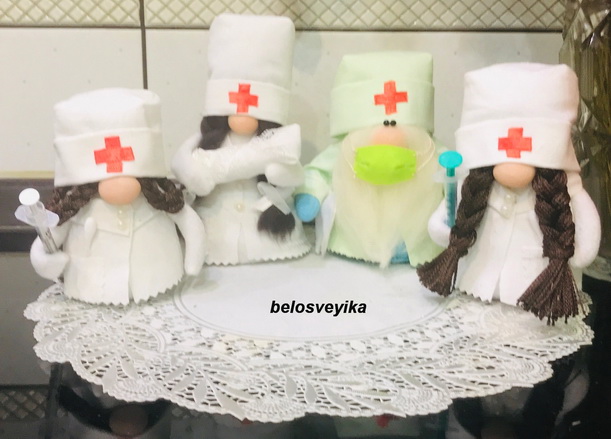 Сшила двух мед сестер и одного повара. У мед сестёр волосы сделала из нитяной занавески, мне отдали мешочек с обрезками.
