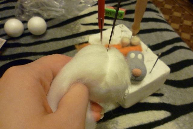 а теперь основное и САМОЕ простое - мягкое тело! Просто оборачиваем шарик шерстью (у меня акрилом) и приваливаем иголкой только полосками, чтобы получился рисунок, похожий на шарики (ну или как Вам нравится)