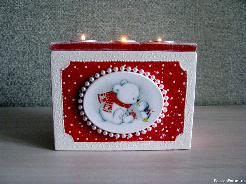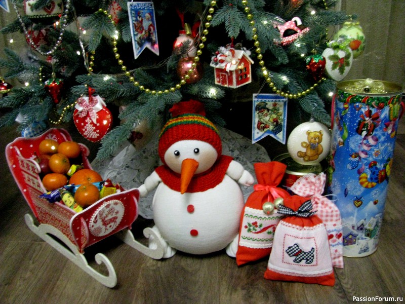 Тома, спасибо за то, что не проходите мимо моего творчества. Комод — фабричного производства ))). Мои - красные санки, короб-подсвечник. Снеговика делала очень давно, из мячей, маленьким внукам на потеху